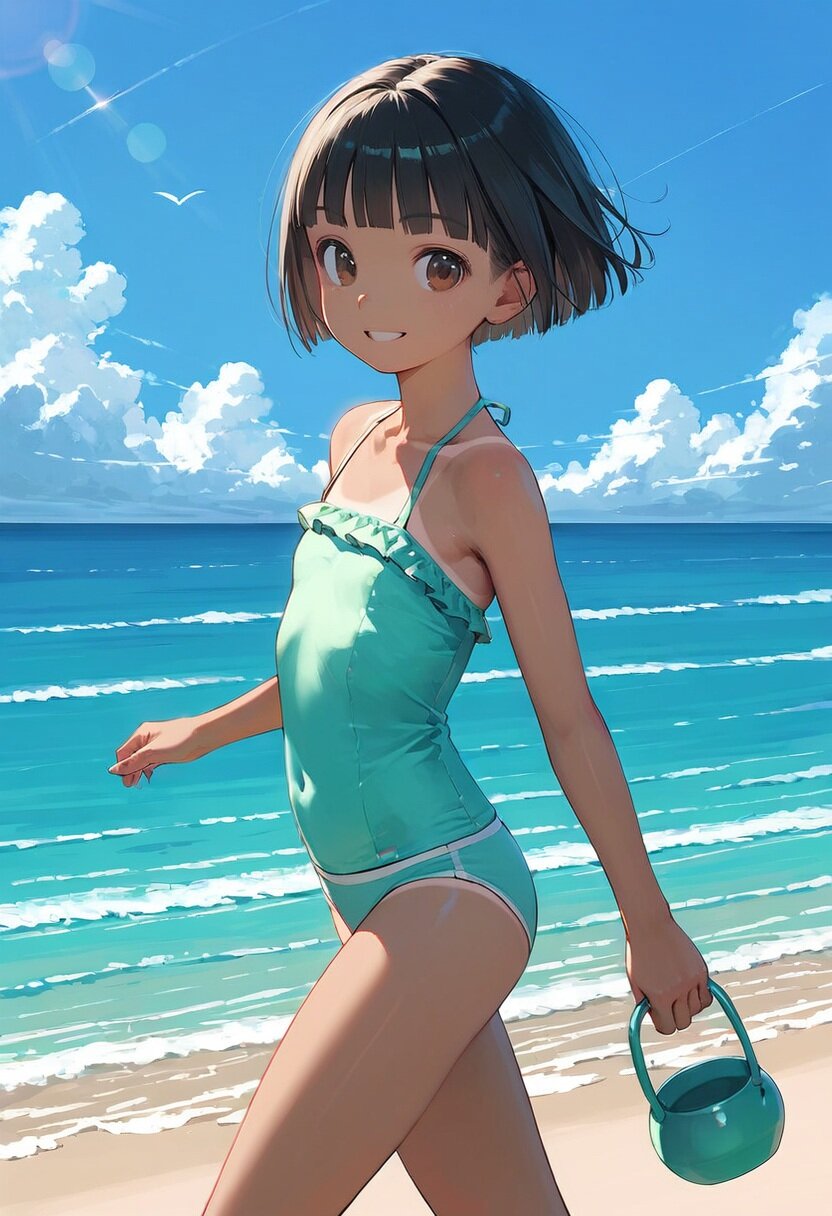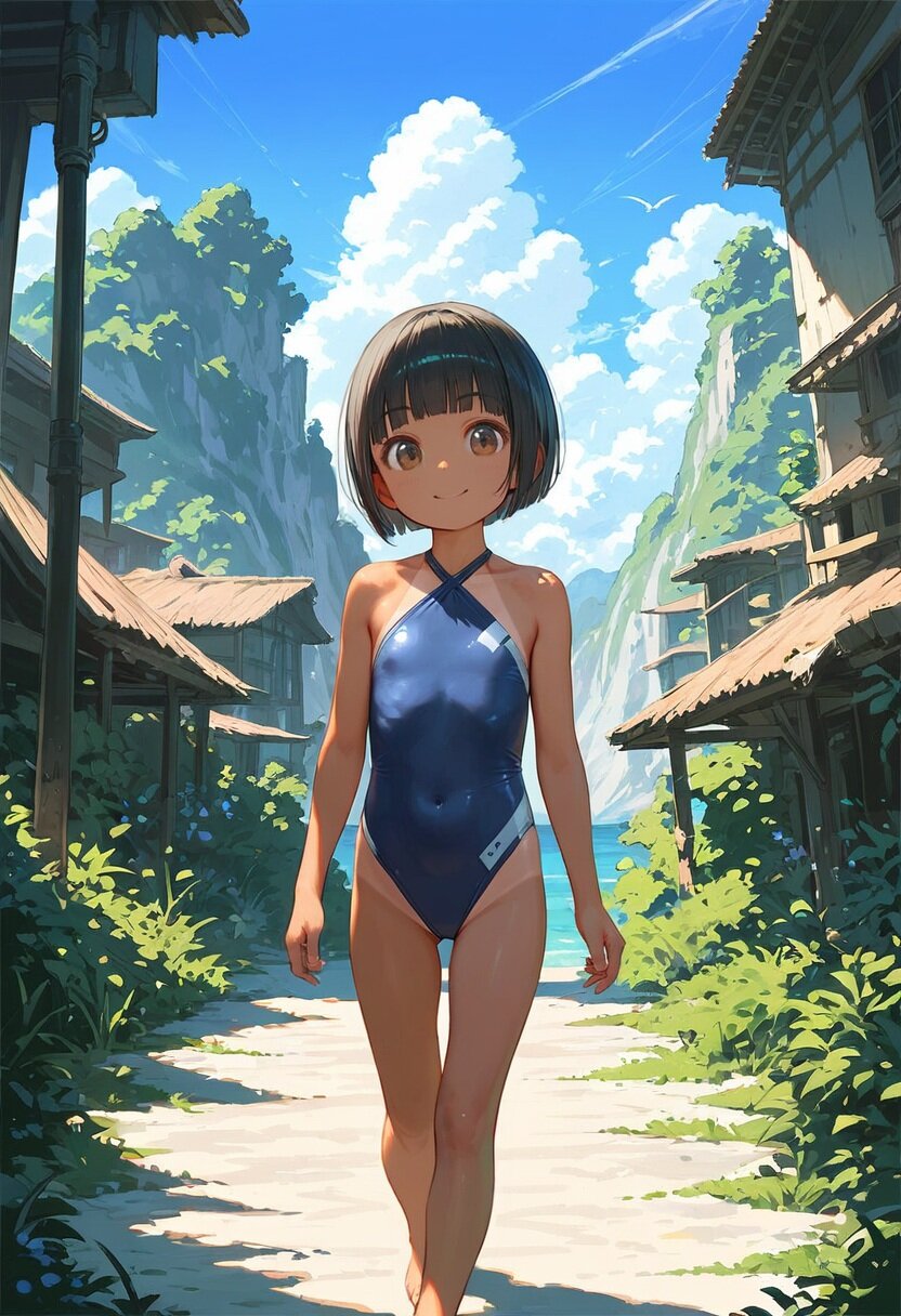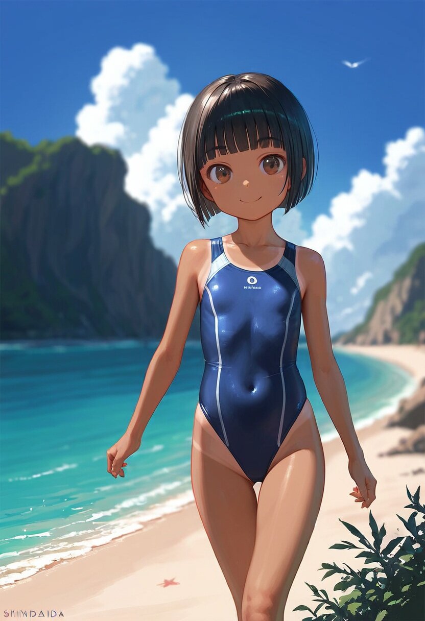 (score_9, score_8_up, score_7_up),detailed skin,wide shot, outdoor,summer beach, BREAK 1girl, (female child, cute,11 yo), black hair,(bowl cut),blunt bangs,flat chest,brown eyes,((tan)), smile, looking at viewer,walking, facing to the side, BREAK (one-piece swimsuit),