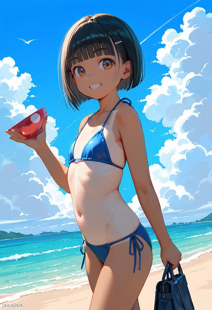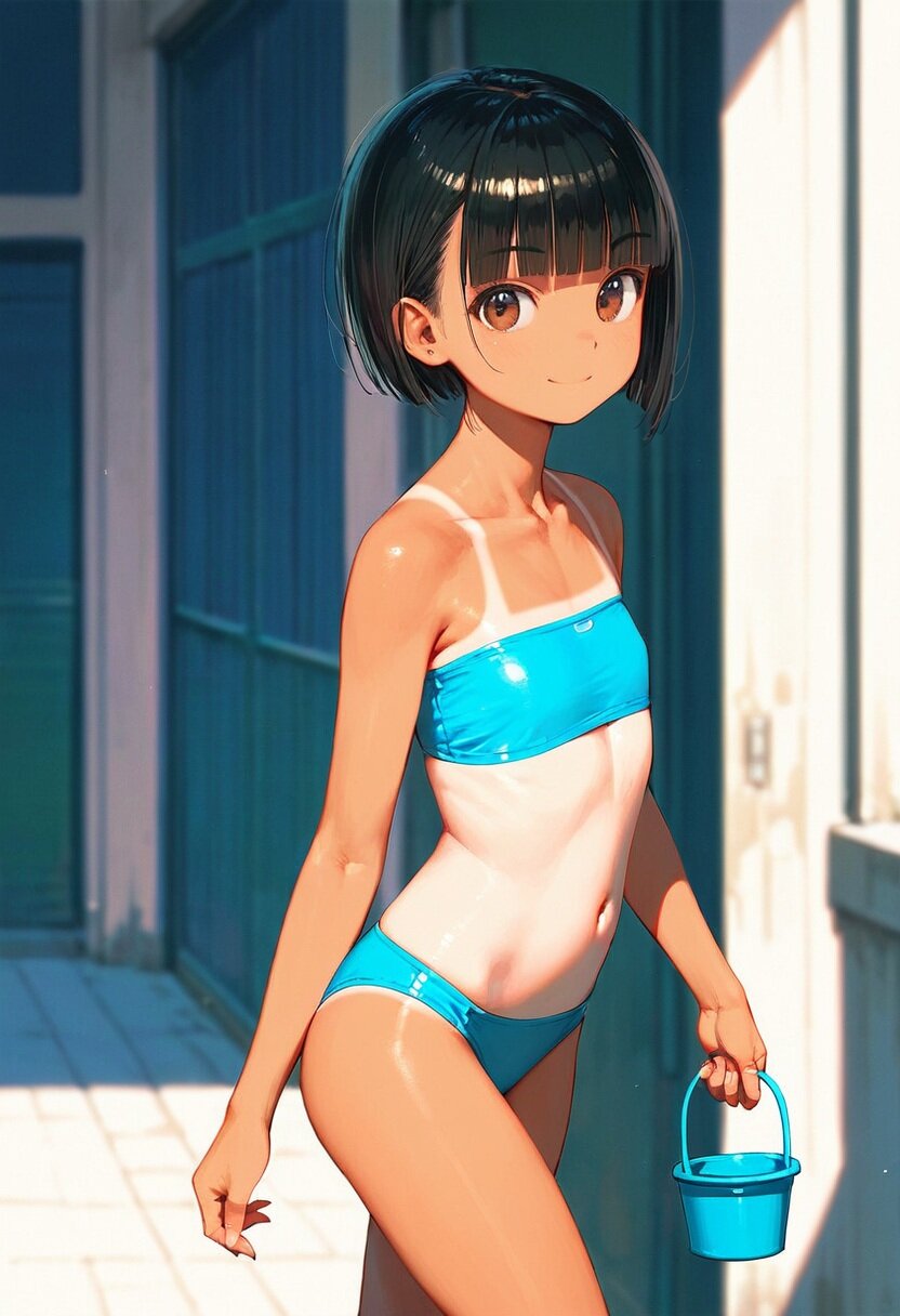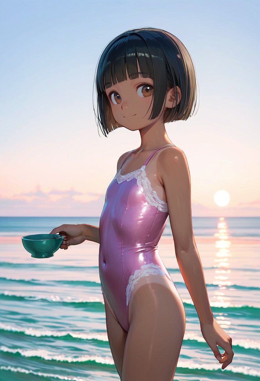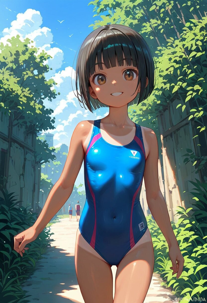 (score_9, score_8_up, score_7_up),detailed skin,wide shot, outdoor,summer beach, BREAK 1girl, (female child, cute,11 yo), black hair,(bowl cut),blunt bangs,flat chest,brown eyes,((tan)), smile, looking at viewer,walking, facing to the side, BREAK (one-piece swimsuit),
