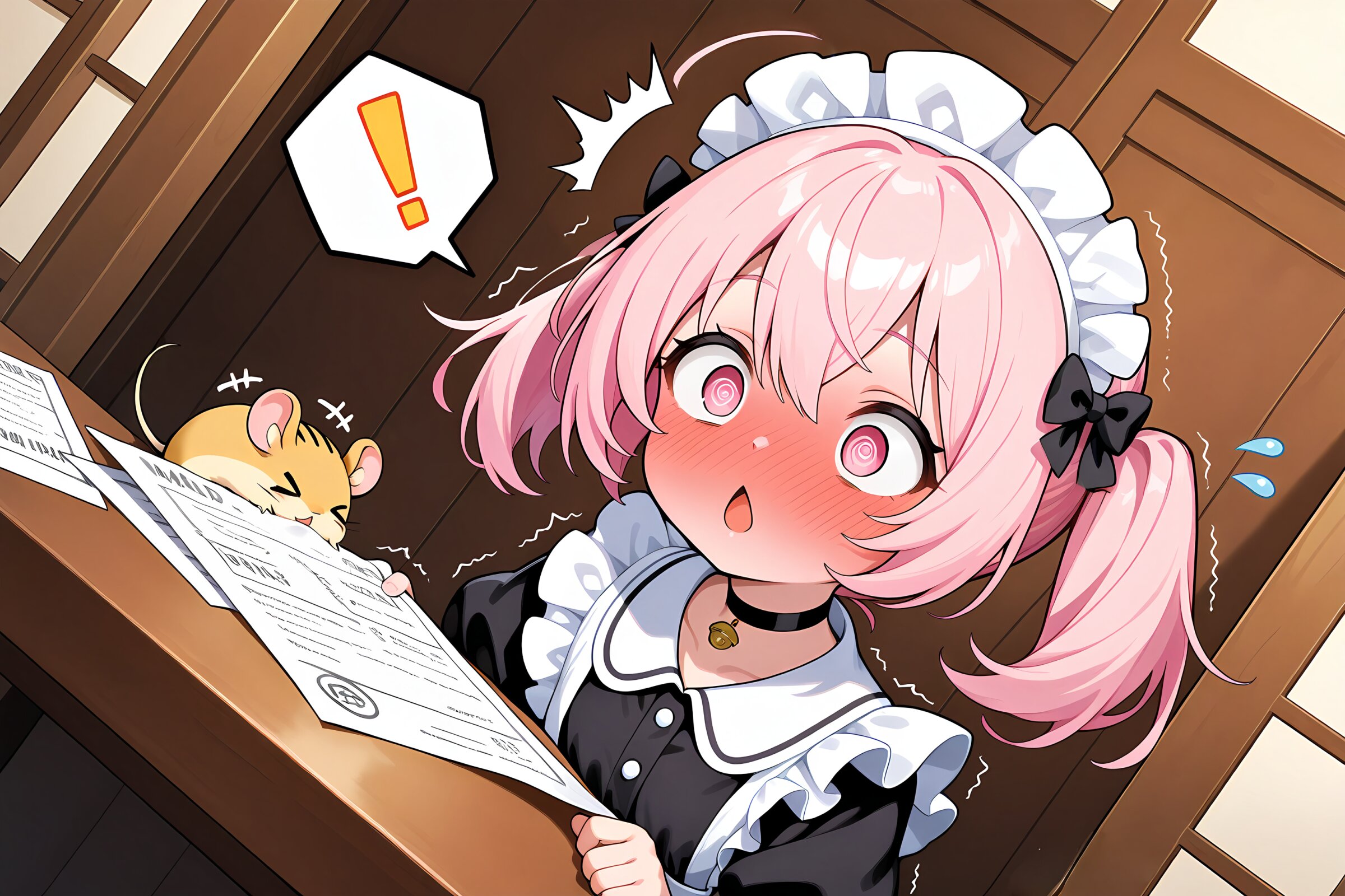 1 little girl, solo, diagonal angle, masterpiece, best quality, amazing quality, very aesthetic, pink hair, twintails, pink eyes, @_@, chestnut mouth, open mouth, full-face blush, wide-eyed, surprised, constricted pupils,^^^, trembling, flying sweatdrops, choker, maid outfit, spoken exclamation mark, (hamsters:1.2), > <, paper, in japanese room,