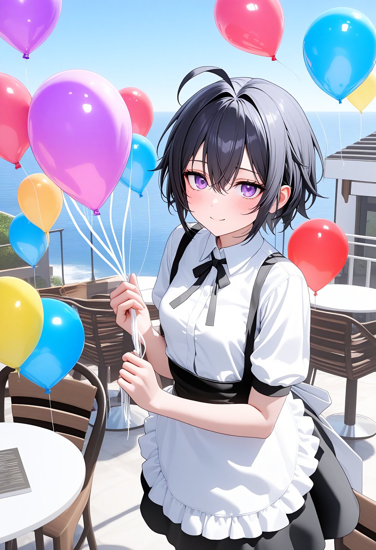 カラフルな風船が全体に明るく楽しい雰囲気を演出しています。空や海の青と風船のビビッドな色合いのコントラストがとても綺麗で、爽やかな屋外のパーティーシーンがうまく表現されています。