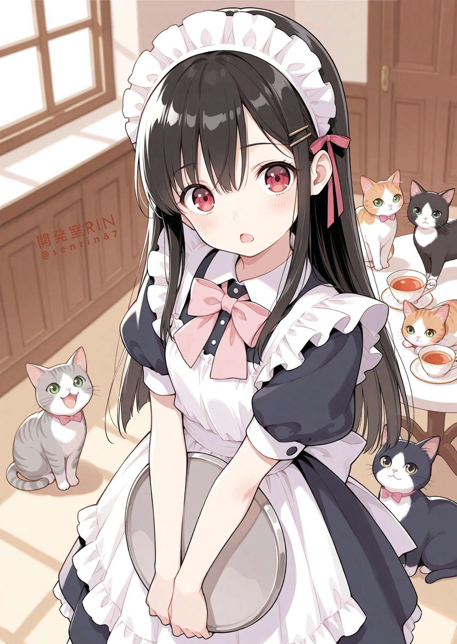 (flat color:0.1),(pale color:0.01), (tareme:0.33), cute 1girl , ruby eyes, straight hair ,black hair ,(hair between eyes:0.7), hairpin, kawaii, (pastel theme :0.1), depth of field, (bokeh:0.5),open mouth, (excited:0.9), (surprised:0.5), head tilt, BREAK (many cats:1.1),(cat:1.3), cats, surrounde by cats, v arms, maid dress, maid headdress, skirt, puffy short sleeves, holding serving_tray, table, cat, tea, pink bowtie, indoors, refined ,hair ribbon,(from above:0.1), (contrapposto:0.9), (from side:0.1),