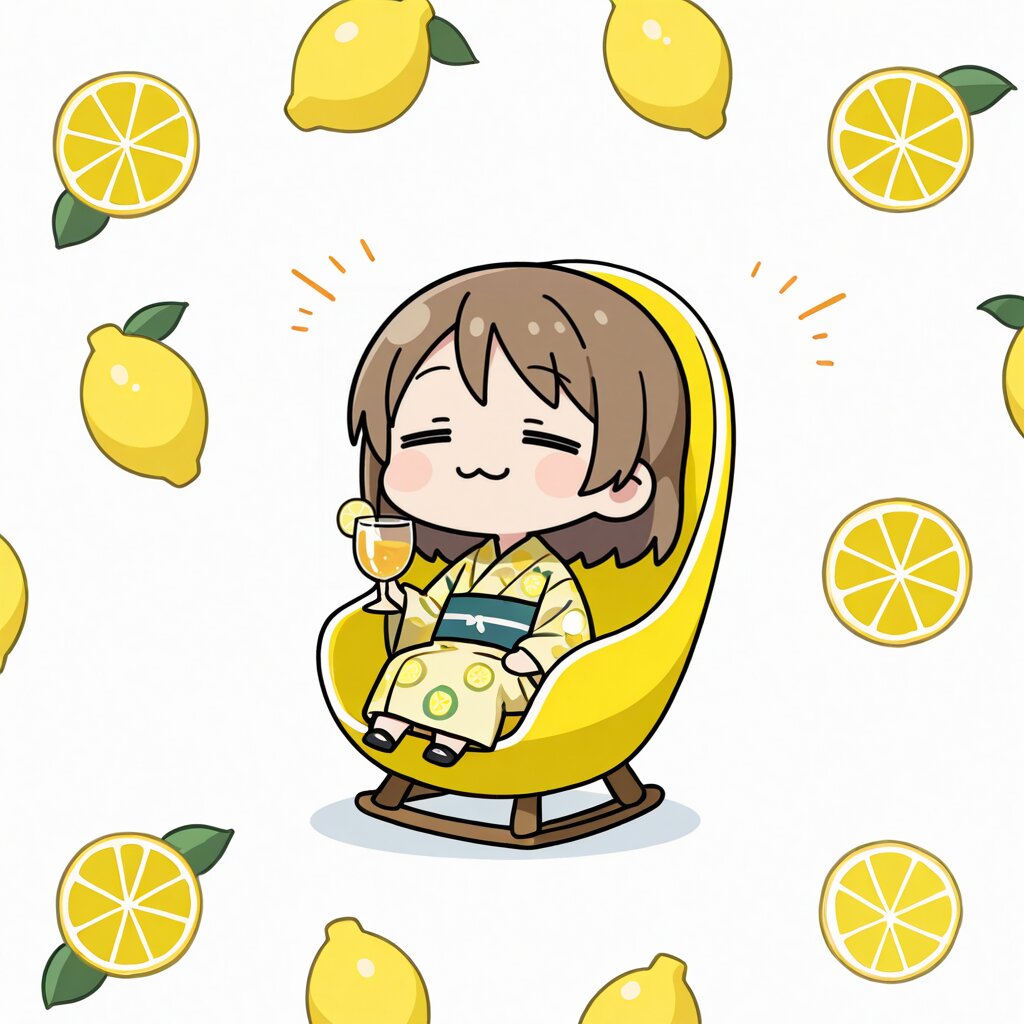 masterpiece,best quality,highres,highly detailed,general,chibi,1girl,solo,=_=,smile,:3,long yellow yukata,lemon patterned yukata,obi,in lemon house,sitting lemon chair,drinking glass,holding a large glass of ice lemon tea,