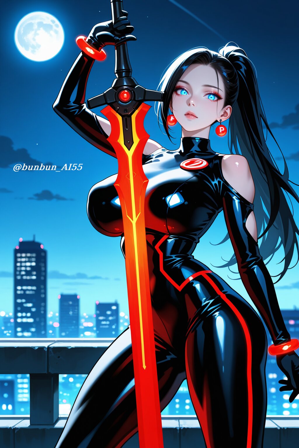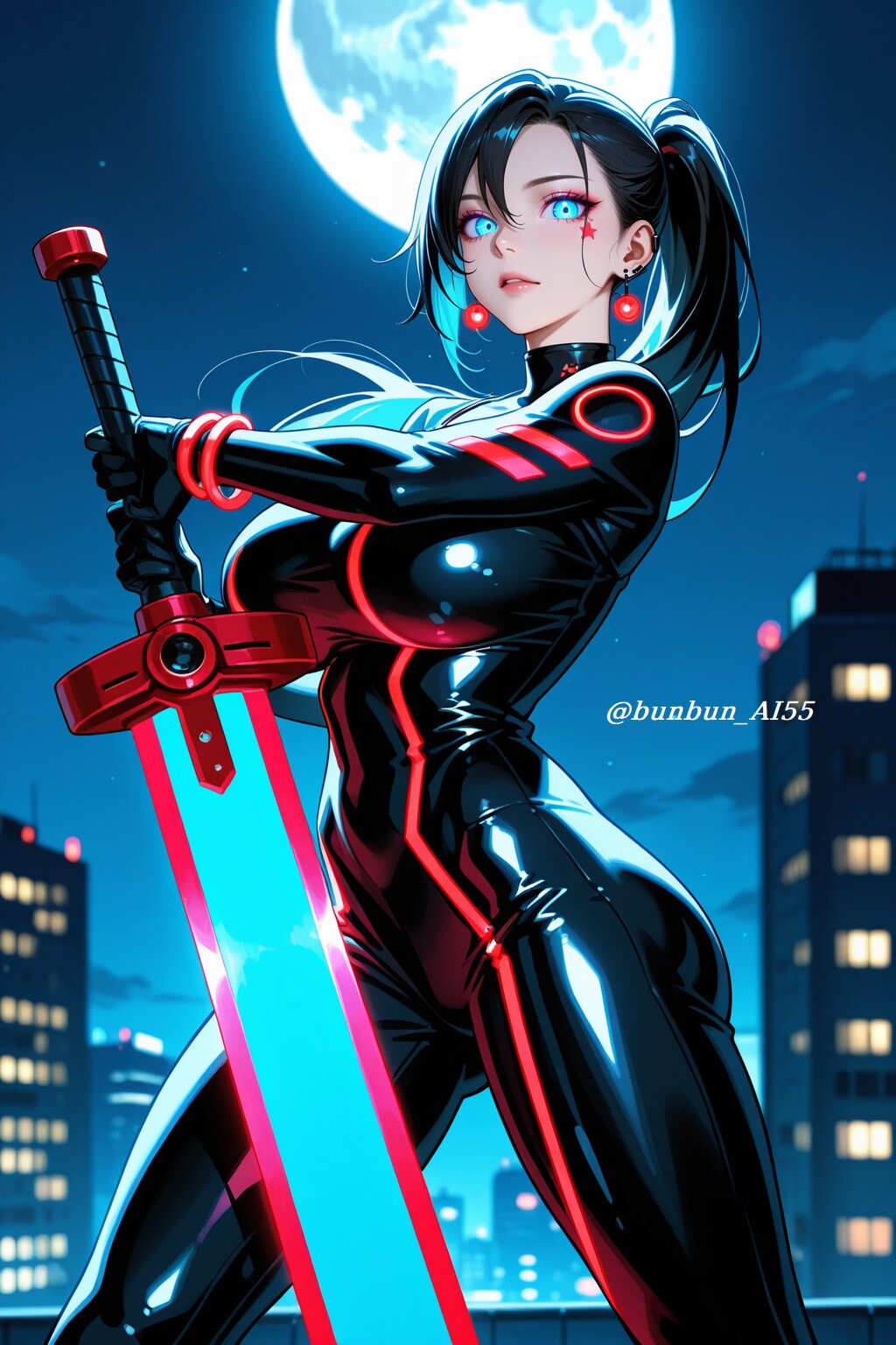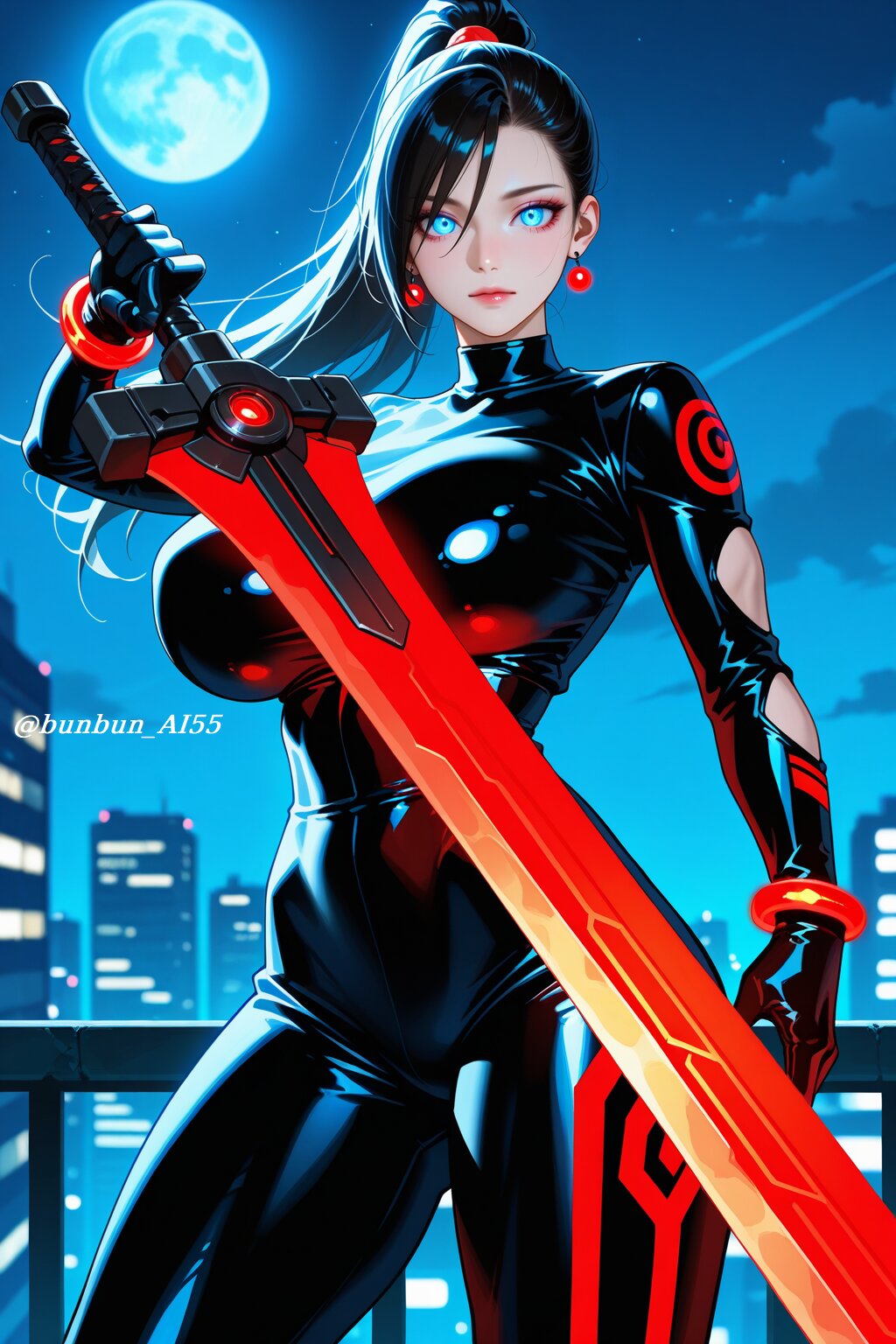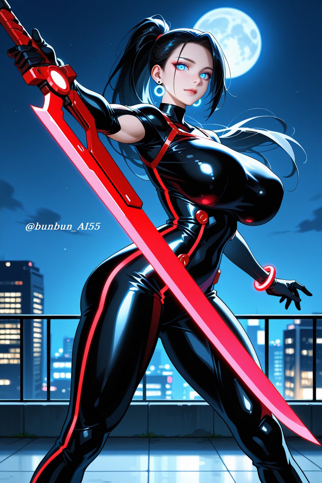 HDR, 8K,masterpiece, best quality, amazing quality, very awa, very aesthetic, absurdres, newest, detailed eyes, realistic eyes, realistic body, highres, add detail, sharp detailes, sharp lines, sharp focus, (realistic, hyperrealistic, photorealistic, realistic shading), sexy style, perfect anatomy, intricate details, depth of field, illustration style, BREAK perfect lighting, professional lighting, face lighting, (1girl, elegant beautiful girl:1.5, 18year old), (cute, kawaii, idol, sexy, model, beauty), (idol face, beautiful face, slim face, small face, cute face, detailed face, model makeup, pink lips), (looking at viewer, alluring gaze, glowing blue eyes, expressionless face), BREAK nsfw, (long black ponytail, straight hair), (jewelry, piercing, earrings, bracelet) (huge breasts, pointy breasts), (long legs, thick thighs, muscle legs), (perfect hands), (shiny skin, glossy skin), (super model body:1.2, muscle body:1.2, slim body, athletic body:1.2), BREAK (wearing a black bodysuit with glowing neon red lines:1.5, asymmetrical body and thigh and arm cutout:1.2, intricate design:1.2), (black latex gloves), (light reflections), (shiny, glossy, luster, latex), (tight fit), BREAK (standing, legs apart, holding a huge mechanical long sword, glowing red blade, posing with sword raised in front of her body, dynamic pose, dynamic action pose, heroic pose), (detailed background, night, full moon, rooftop, skyscraper, city lights, dramatic lighting, cinematic), (face focus shot, upper body portrait:1.2, bust shot:1.2),