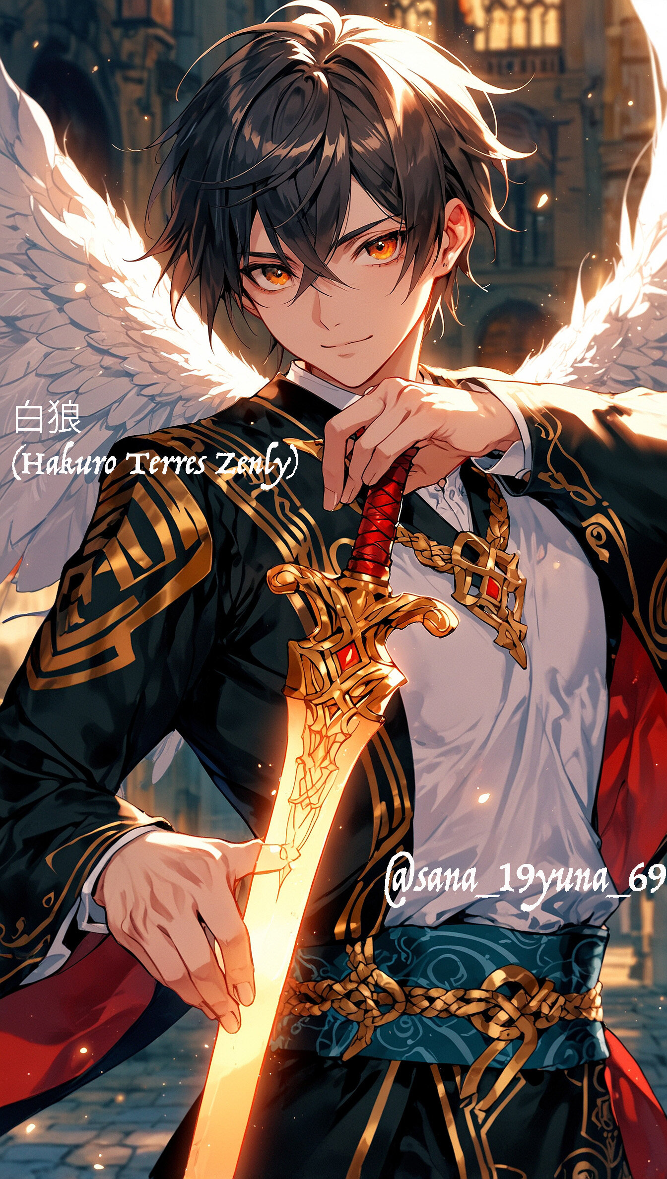 作品は、白狼(Hakuro Terres Zenly)の目の一部をコンタクトレンズで再現し、独自の紋様柄が入った服を着て独自の紋様が入った剣を持つ様子❤️(公開してない部分の一部の中のとある1枚)