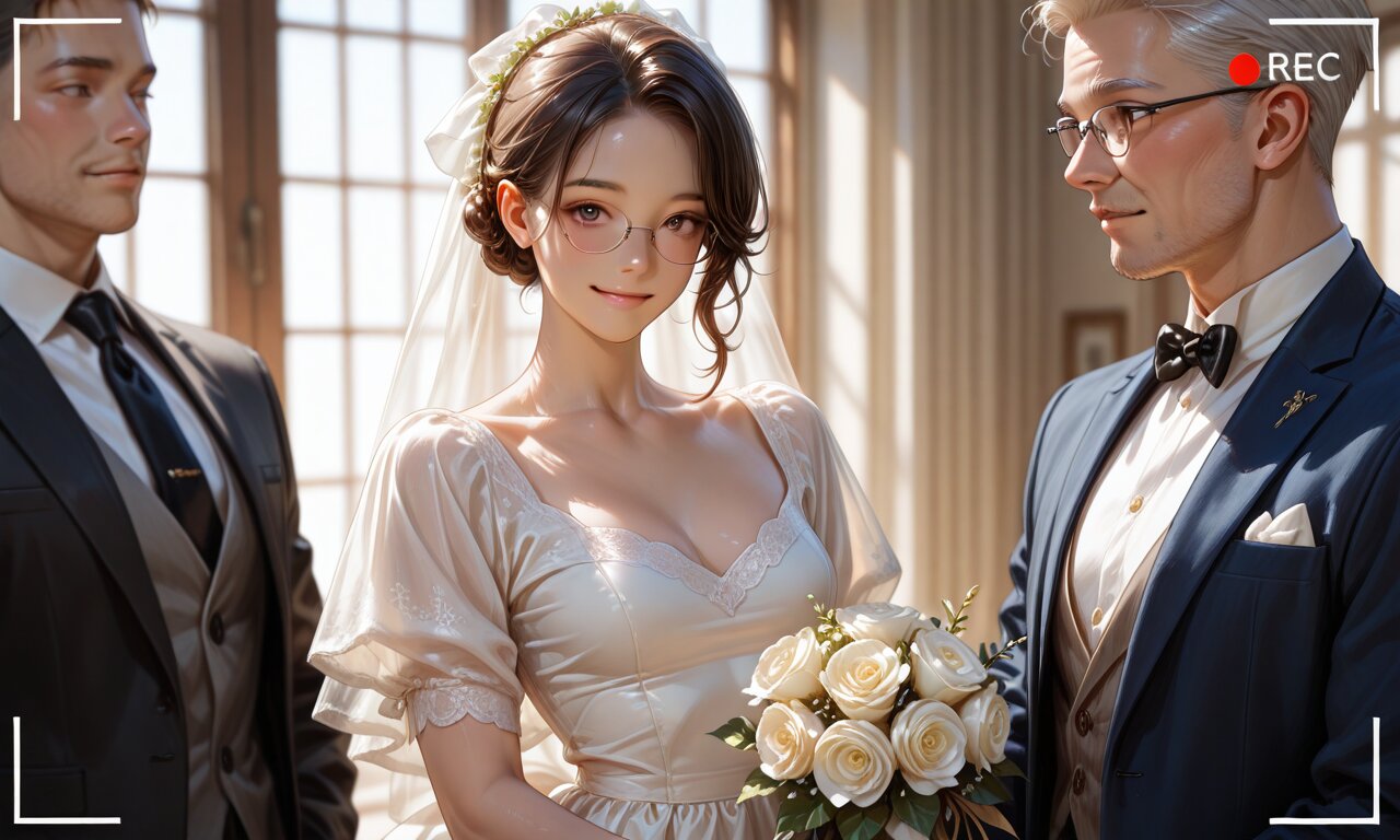 sharp focus, (theme is Daughter's wedding), sfw:1.2, 1boy, mature character, glasses, muscular, japanese old man, family formal wear, tear up, dandy smile face, holding a Wedding bouquet. The two stand close together. medium breast, slim waist, brown eyes, looking at viewer, BREAK, volumetric lighting, highly detailed, 4k resolution, cinematic lighting, flirty expression, --ar 16:9 --v 5 --q 2, beautiful eyes, score_9, ultra detailed hair and face, beautiful lips, masterpiece, amazing quality, very aesthetic, high resolution, ultra-detailed, absolute, newest, realistic skin, photorealistic, moe heroine, photograph, video recording,, <lora:elf-san alpha1:0.7> <lora:elf-san alpha4(IL1.0):0.7>, score_9, score_8_up, score_7_up, source_realistic, masterpiece, amazing quality, very aesthetic, high resolution, ultra-detailed, realistic, moe heroine, sharp focus, photorealistic,