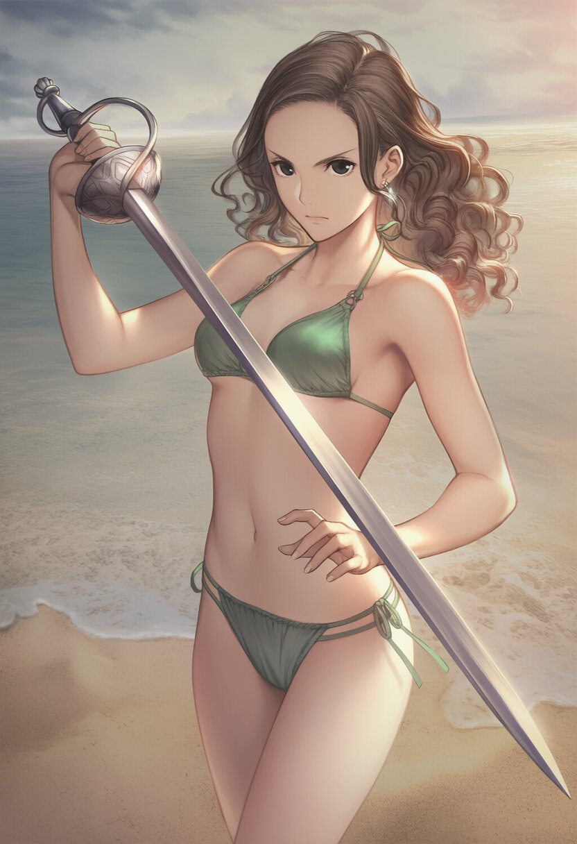 {{{highly detailed}}}, {{official style}}, {{game cg}}, {{25 year old women}}, {{adult women}}, {{slender}}, {{fate}}, {{{{woman of lofty virtue}}}}, 1girl, black eyes, {{{long hair, brown hair, wavy curly hair}}}, forehead, medium breasts, serious, {{{battle, fighting stance, holding a rapier}}}, cowboy shot, walking, green bikini, ocean, sandy beach, {{{masterpiece}}}, {{{best quality}}}, {{{very aesthetic}}}, {{{ultra-detailed}}}, {illustration}, {{{extremely detailed}}}, {{{an extremely delicate and beautiful}}}