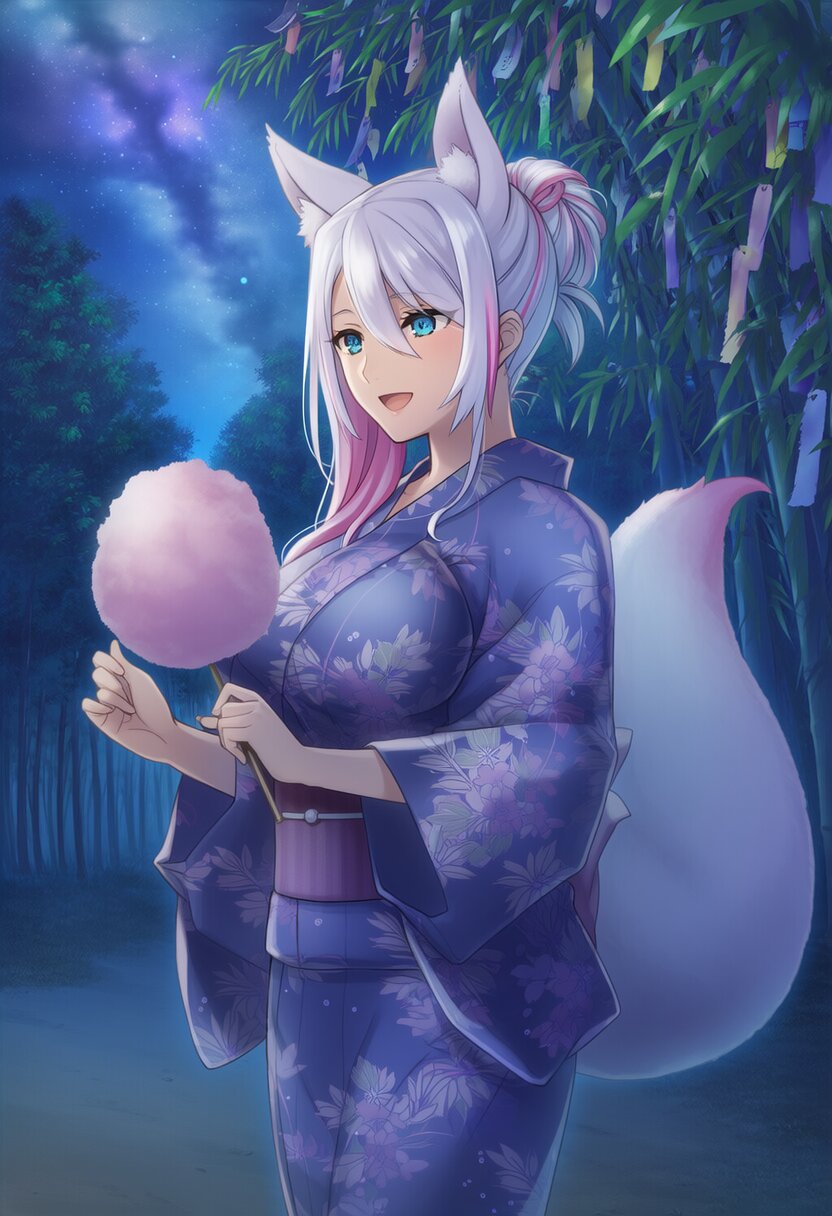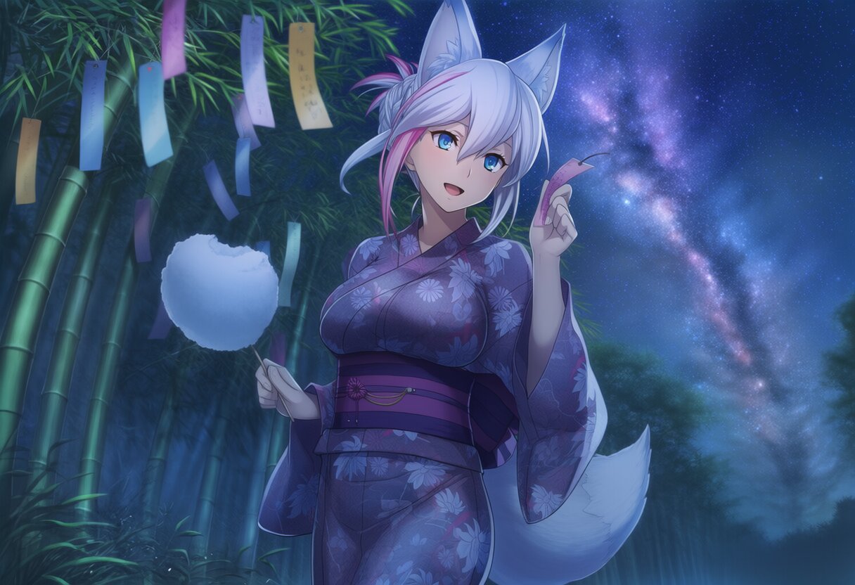 {{{highly detailed}}}, {{official style}}, {{game cg}}, {{tenka hyakken}}, {{adult woman}}, 1girl, solo, blue eyes, single hair bun, {{{white hair, pink hair, two-tone hair}}}, hair between eyes, [[[large breasts]]], fox ears, fox tail, smile, open mouth, holding a cotton candy, standing, cowboy shot, purple flower-patterned yukata, night, milky way, {{{{{{bamboo grove, tanabata, colorful ribbons hang from the trees}}}}}}, prayer flags, hanging trees, beautiful image, traditional japanese colors, {{{masterpiece}}}, {{{best quality}}}, {{{very aesthetic}}}, {{{ultra-detailed}}}, {illustration}, {{{extremely detailed}}}, {{{an extremely delicate and beautiful}}}