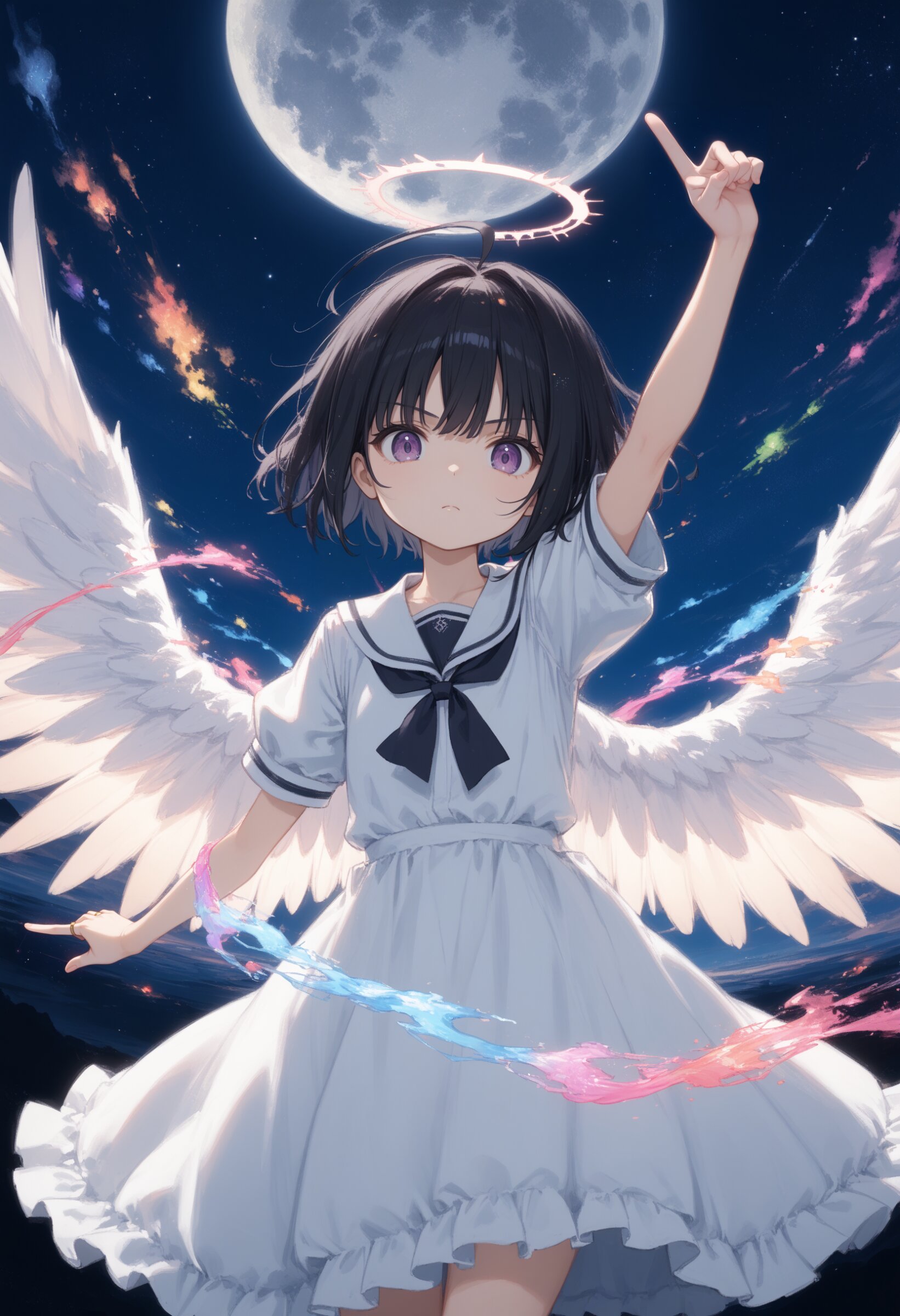 score_9,score_8_up,score_7_up,source anime,best quality,masterpiece,8k,extremely detailed CG unity 8k wallpaper,(dynamic_angle:1.2),from_above,depth of field,1girl,straight arms,pointing_up,(reach arm up:1.2),(moon:1.2),(reft arm behind:1.2),space,starry sky,excessive big white wings,flat chest,purple eyes,short hair,black hair,summer_uniform,ahoge,(colorful effects:1.2),serious, simple ring halo,full_shot,looking_at_viewer,