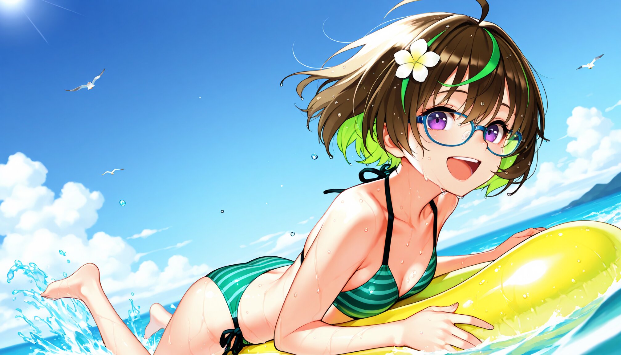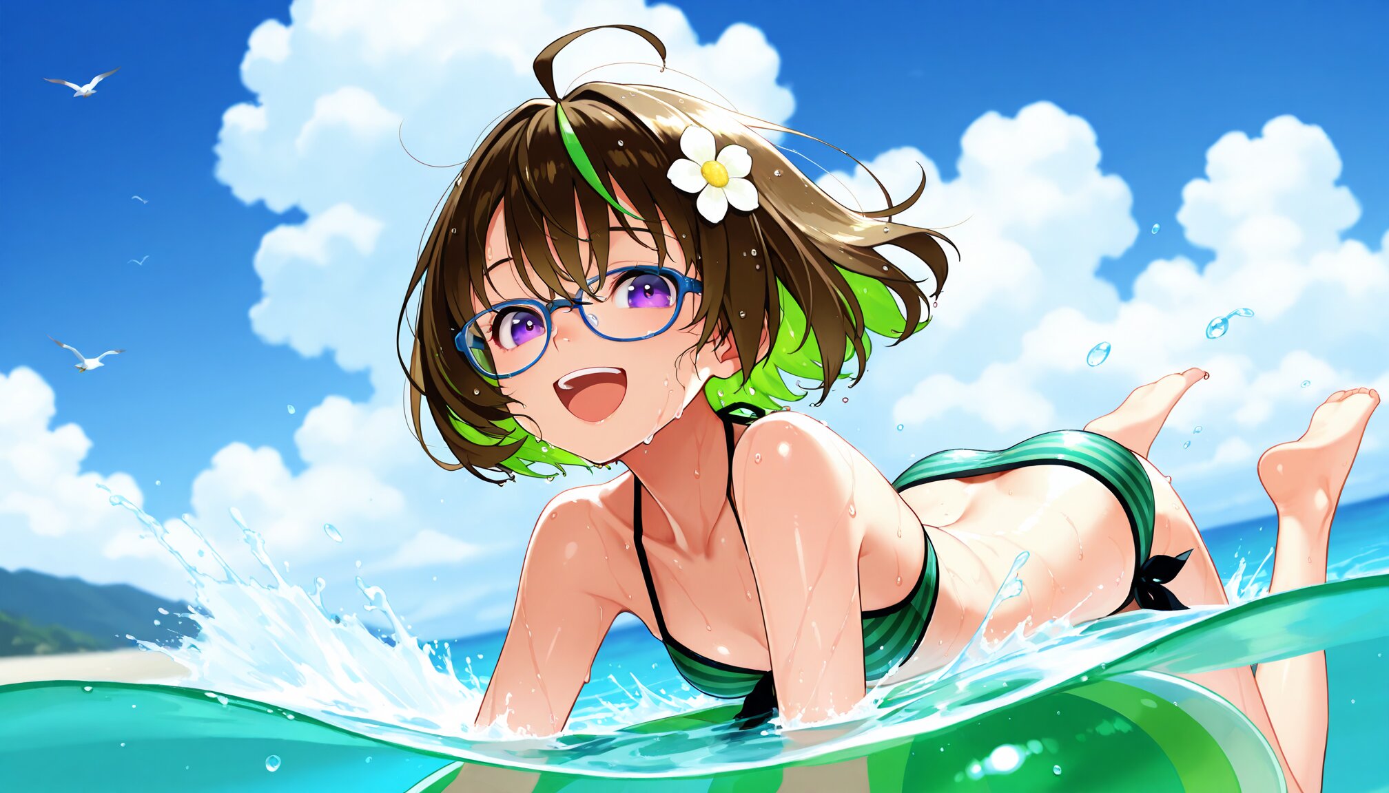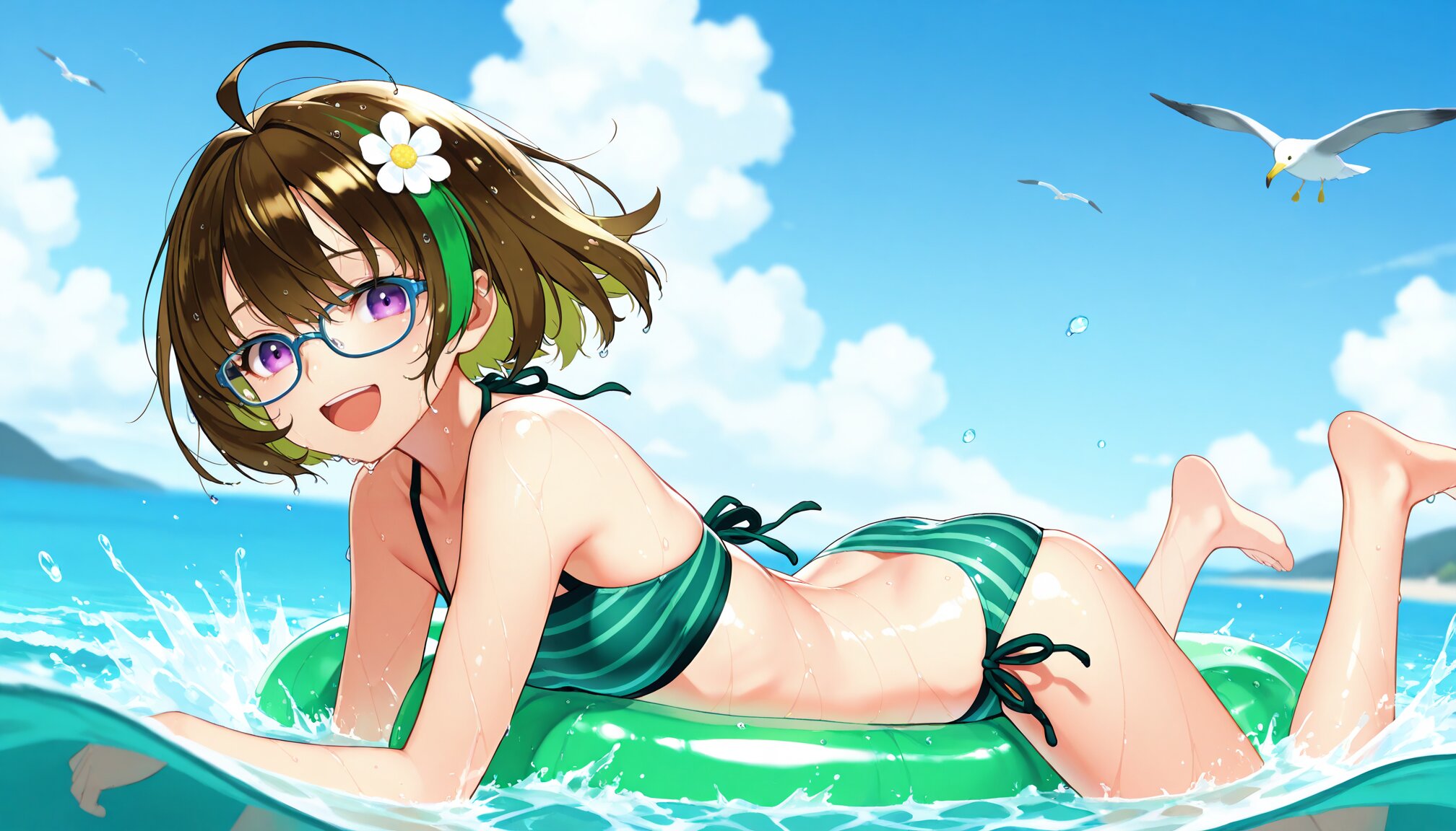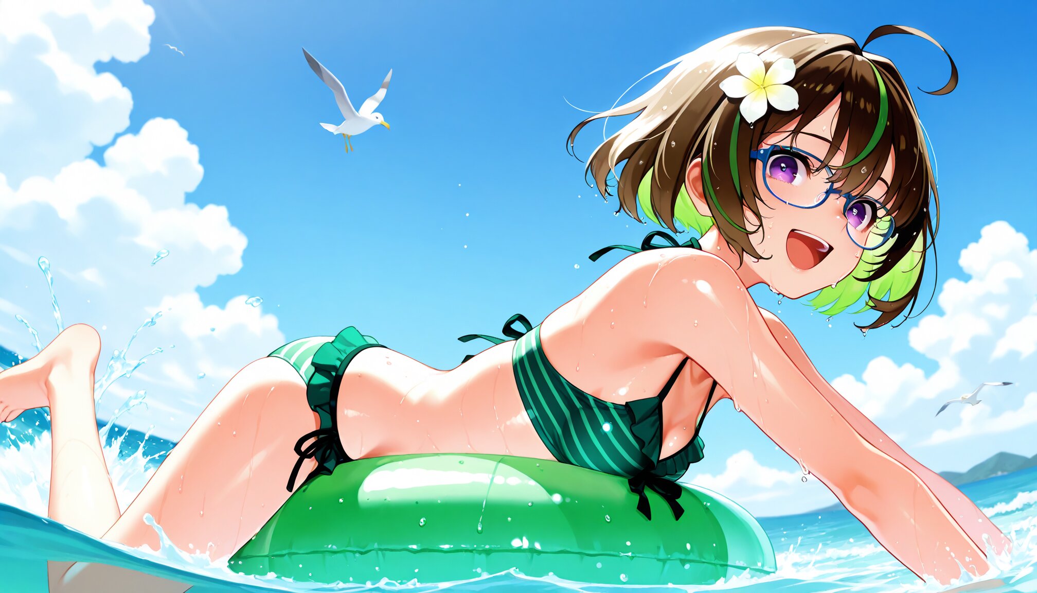 female,adult woman,solo,(shorthair,brown hair:1.3),(green streaked hair:1.5),(hair detail:1.2),purple eyes,facial detail, (ahoge:1.2),(glossy hair:1.3), (bangs bangs:1.2),hair between eyes:1.1,(small breasts:1.2),(green striped bangs:1.1),white flower hair ornament,(details of glasses:1.1),blue-framed_eyewear,(green hair:1.2),green bangs,(emerald color inner hair color:1.2),(looking_at_viewer:1.1),(kind_smile:0.8),(wide eyes:0.9),(happy:1.1),:d,(flying hair:1.2),surprising,looking_back,front view,dynamic_angle,<lora:XL‗Zasuko_Nomal_V2-000005:0.2>,XL‗Zasuko_Nomal,mid_shot,full_shot,beach,blue sky,white clouds,seagull,waves,green striped bikini swimsuit,water play,shallow water,splash,barefoot,water droplets,sweat,float,water play,laughing,open mouth,soaked,wet hair,water-soaked,wet glasses,soaking,