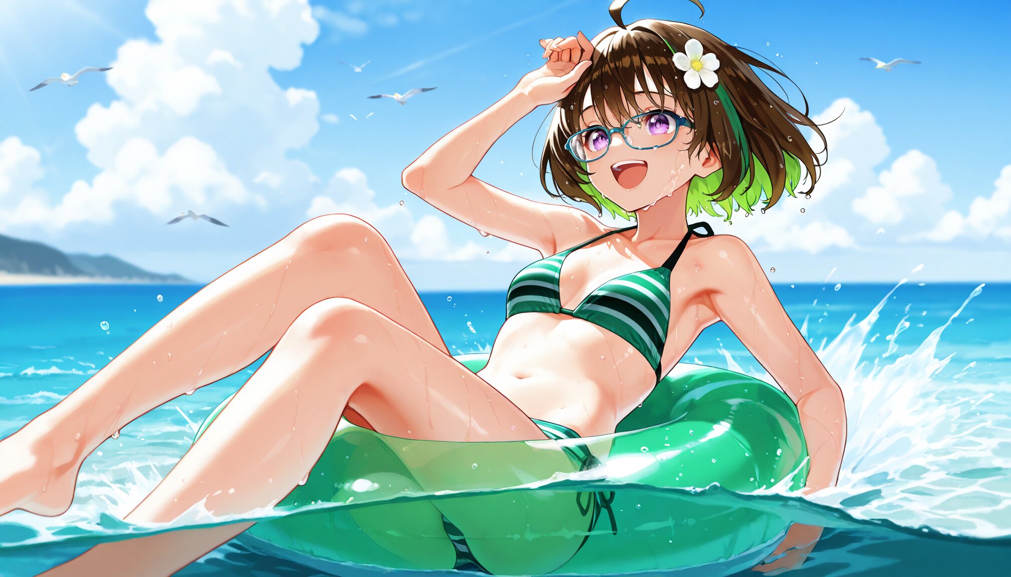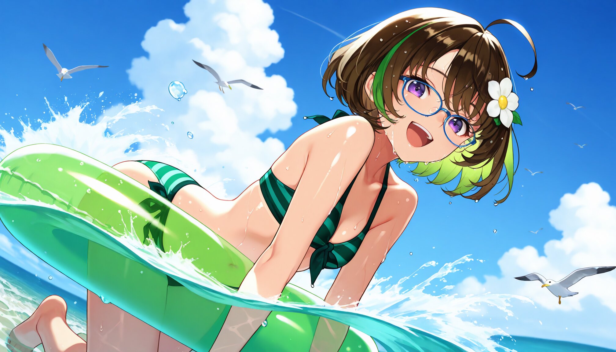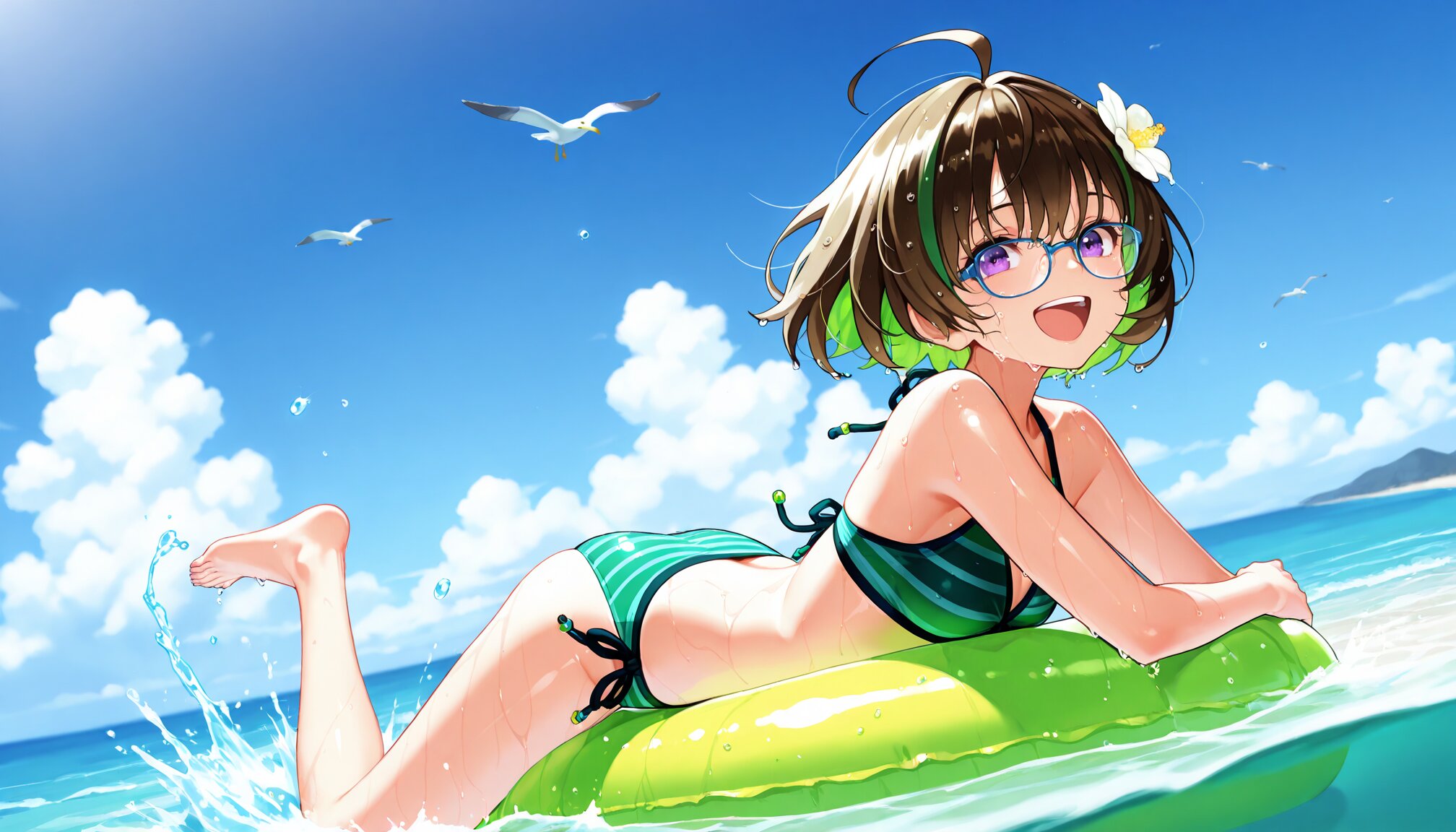 female,adult woman,solo,(shorthair,brown hair:1.3),(green streaked hair:1.5),(hair detail:1.2),purple eyes,facial detail, (ahoge:1.2),(glossy hair:1.3), (bangs bangs:1.2),hair between eyes:1.1,(small breasts:1.2),(green striped bangs:1.1),white flower hair ornament,(details of glasses:1.1),blue-framed_eyewear,(green hair:1.2),green bangs,(emerald color inner hair color:1.2),(looking_at_viewer:1.1),(kind_smile:0.8),(wide eyes:0.9),(happy:1.1),:d,(flying hair:1.2),surprising,looking_back,front view,dynamic_angle,<lora:XL‗Zasuko_Nomal_V2-000005:0.2>,XL‗Zasuko_Nomal,mid_shot,full_shot,beach,blue sky,white clouds,seagull,waves,green striped bikini swimsuit,water play,shallow water,splash,barefoot,water droplets,sweat,float,water play,laughing,open mouth,soaked,wet hair,water-soaked,wet glasses,soaking,