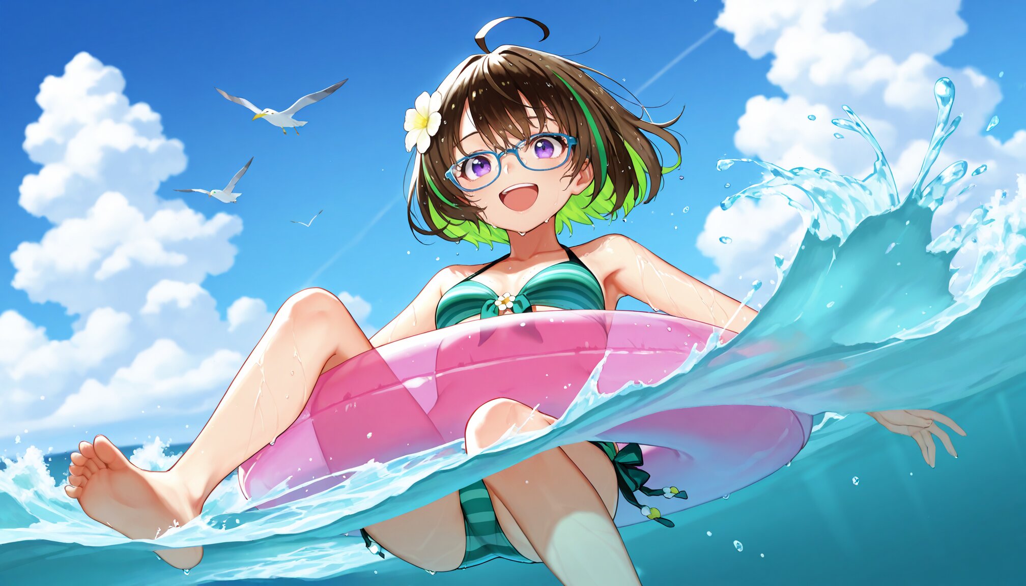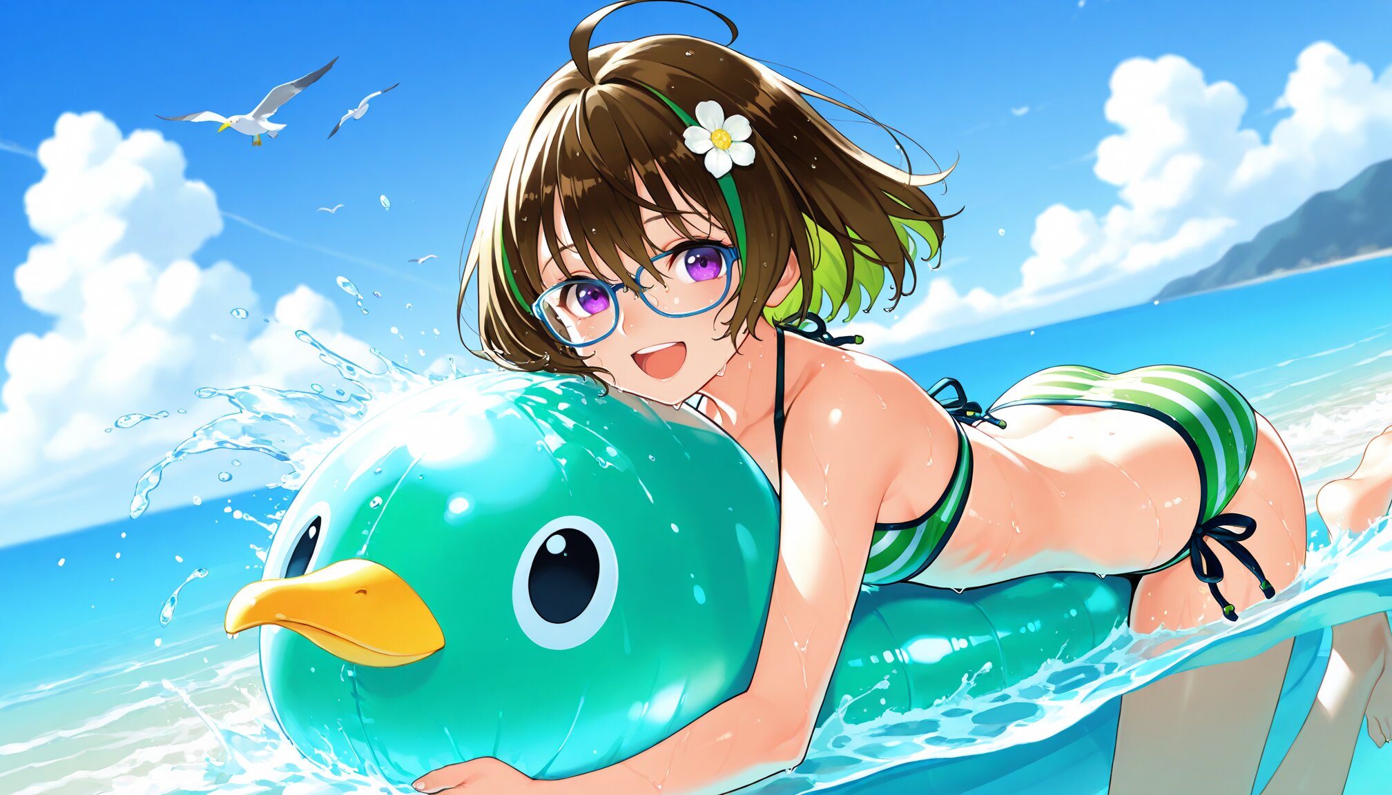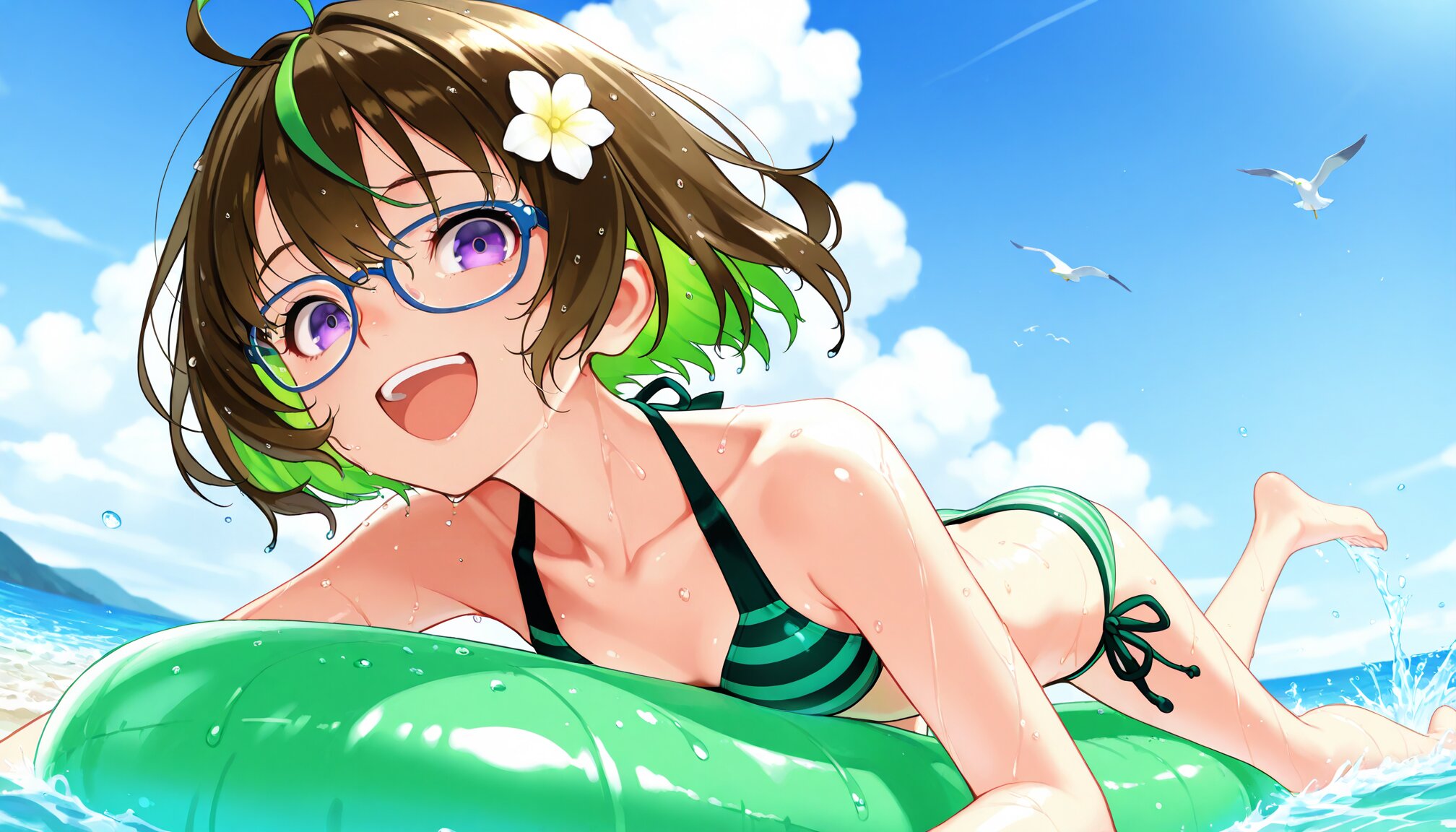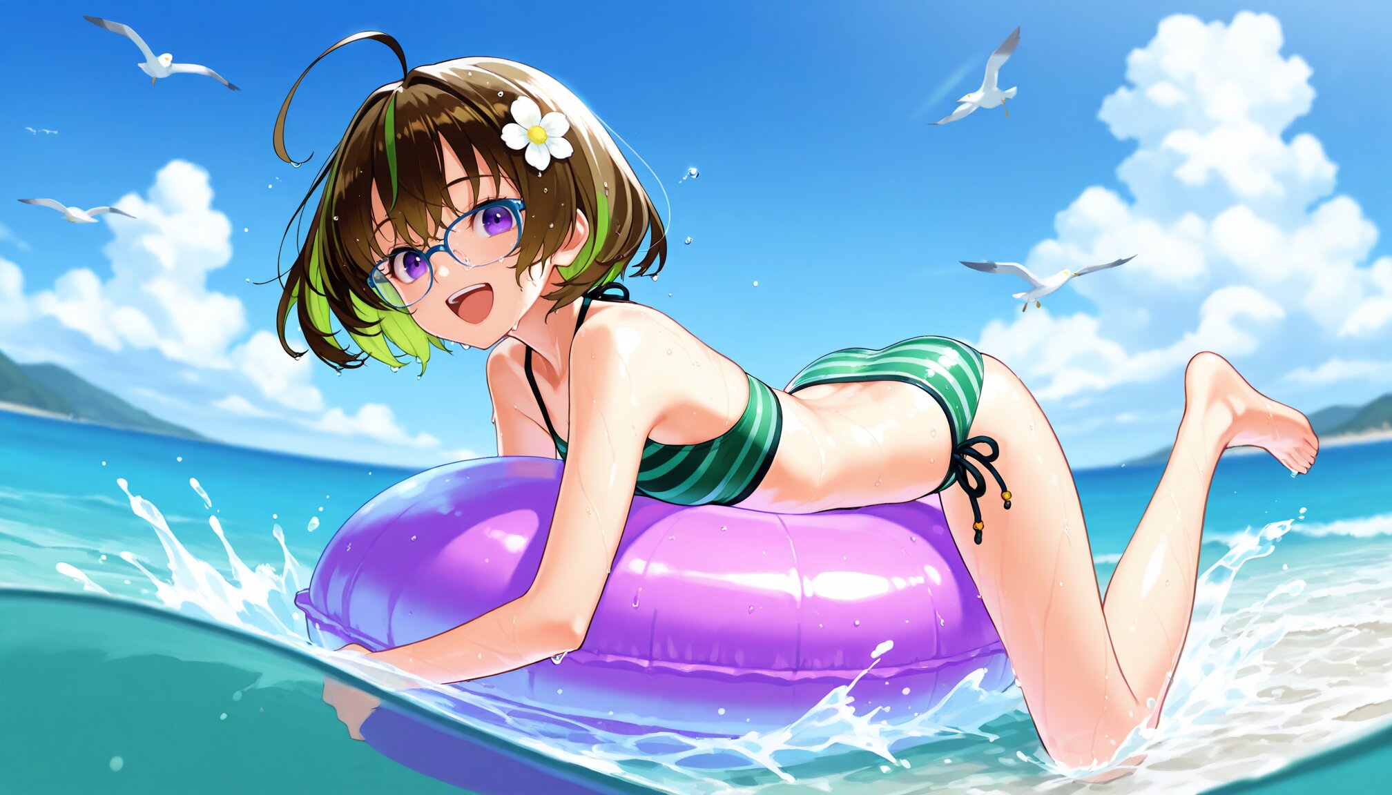 female,adult woman,solo,(shorthair,brown hair:1.3),(green streaked hair:1.5),(hair detail:1.2),purple eyes,facial detail, (ahoge:1.2),(glossy hair:1.3), (bangs bangs:1.2),hair between eyes:1.1,(small breasts:1.2),(green striped bangs:1.1),white flower hair ornament,(details of glasses:1.1),blue-framed_eyewear,(green hair:1.2),green bangs,(emerald color inner hair color:1.2),(looking_at_viewer:1.1),(kind_smile:0.8),(wide eyes:0.9),(happy:1.1),:d,(flying hair:1.2),surprising,looking_back,front view,dynamic_angle,<lora:XL‗Zasuko_Nomal_V2-000005:0.2>,XL‗Zasuko_Nomal,mid_shot,full_shot,beach,blue sky,white clouds,seagull,waves,green striped bikini swimsuit,water play,shallow water,splash,barefoot,water droplets,sweat,float,water play,laughing,open mouth,soaked,wet hair,water-soaked,wet glasses,soaking,