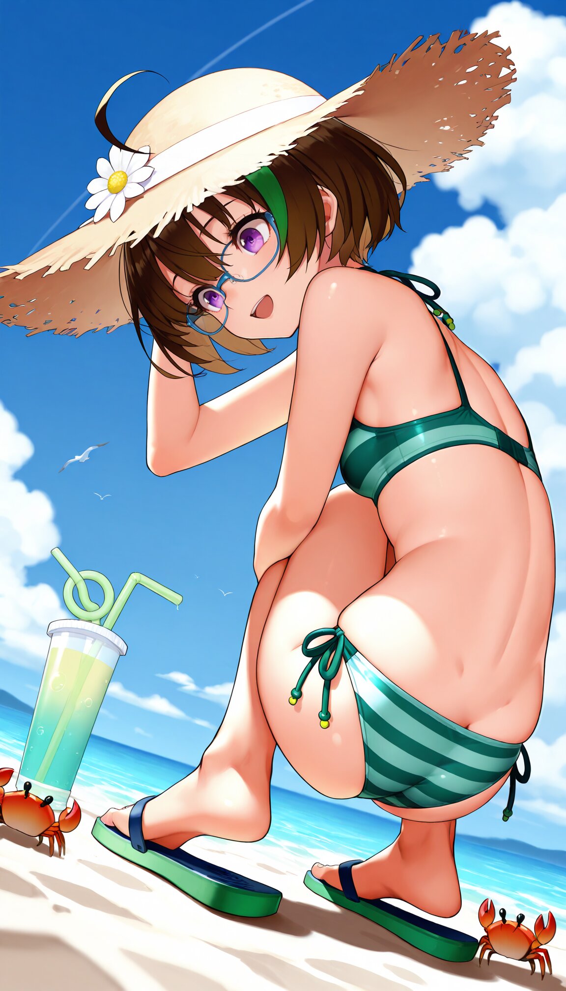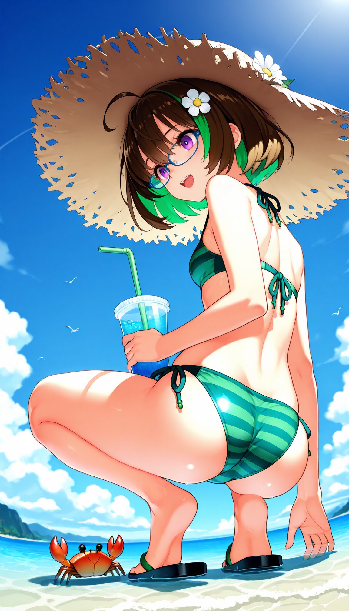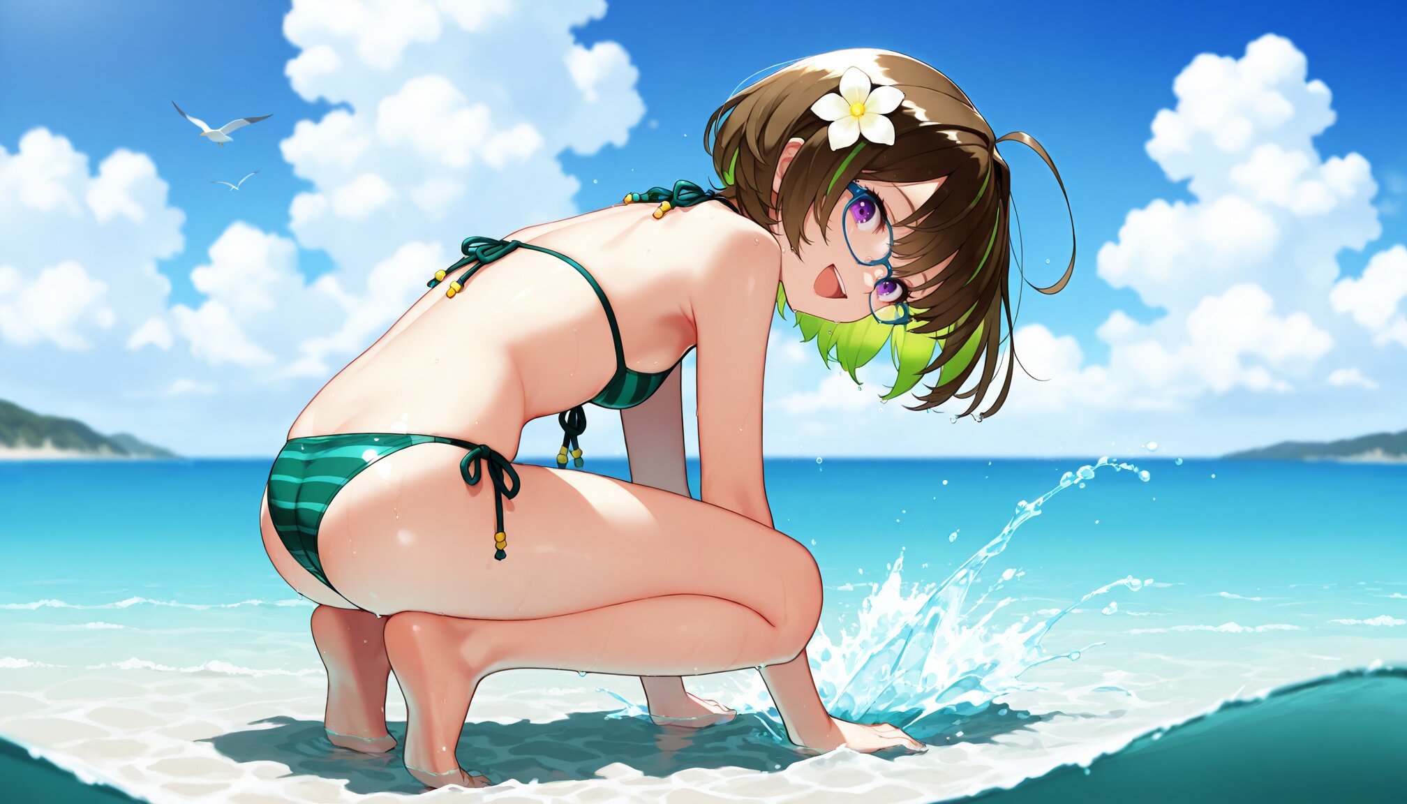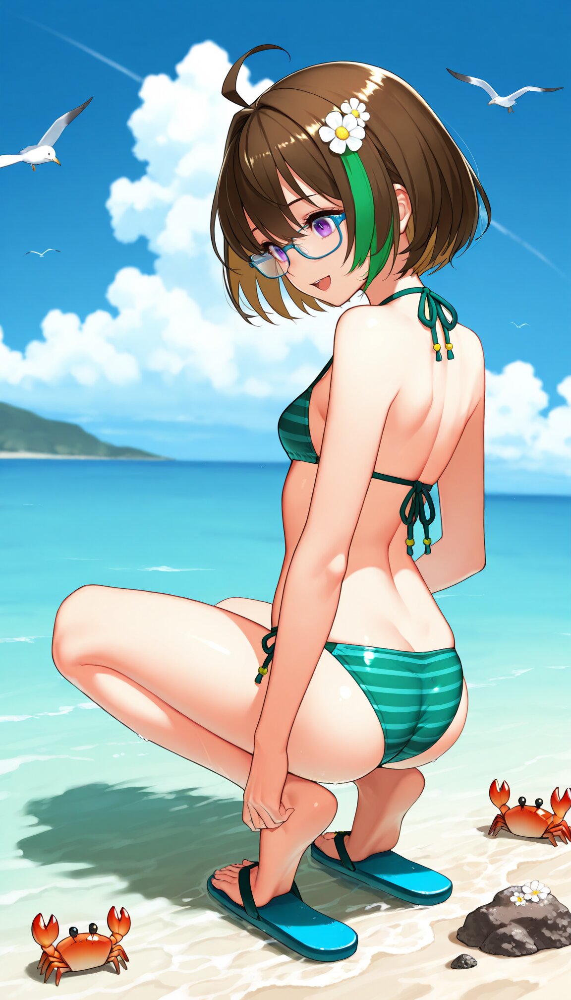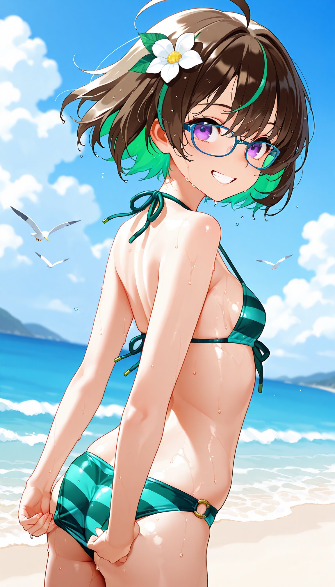 female,adult woman,solo,(shorthair,brown hair:1.3),(green streaked hair:1.5),(hair detail:1.2),purple eyes,facial detail, (ahoge:1.2),(glossy hair:1.3),grin, (bangs bangs:1.2),hair between eyes:1.1,(small breasts:1.2),(green striped bangs:1.1),white flower hair ornament,(details of glasses:1.1),blue-framed_eyewear,(green hair:1.2),green bangs,(emerald color inner hair color:1.2),(looking_at_viewer:1.1),(kind_smile:0.8),(wide eyes:0.9),(happy:1.1),:d,(flying hair:1.2),surprising,looking_back,front view,dynamic_angle,<lora:XL‗Zasuko_Nomal_V2-000005:0.2>,waves,XL‗Zasuko_Nomal,mid_shot,full_shot,wet hair,beach,blue sky,white clouds,seagull,green striped bikini swimsuit,adjusting_swimsuit,swimsuit_pull,bikini_pull,