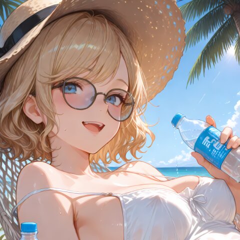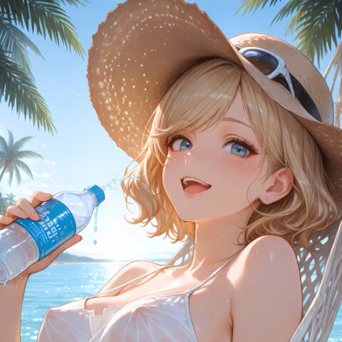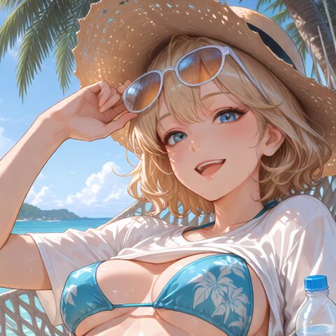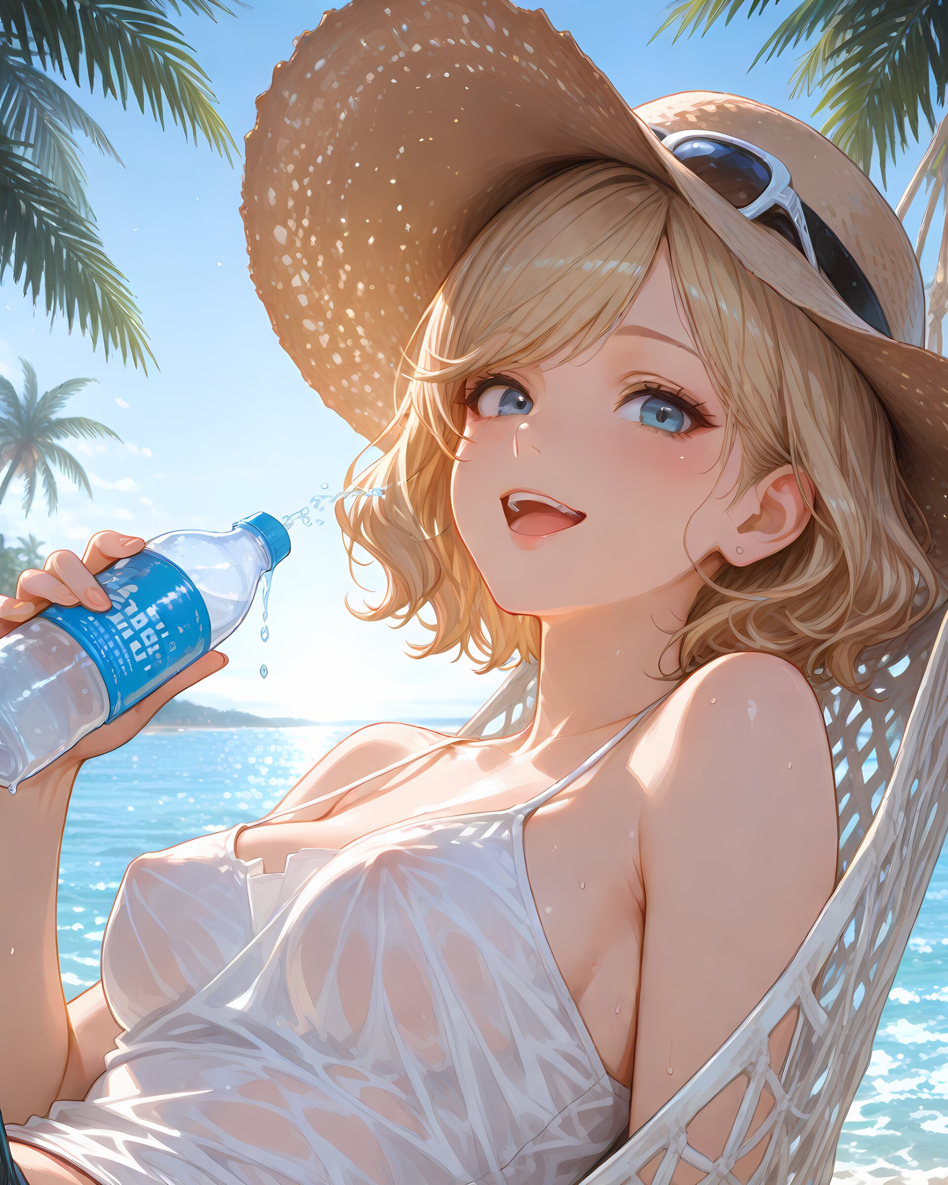 <lora:hyper_sdxl_8_step_lora_f16:1>,, 1girl, lying hammock, drinking juice bottle, sea, palm tree, soft natural light, focus on face, close-up, BREAK 18 years old, girl, short hair, wavy blonde hair, swept bangs, medium breasts, slender, frosty blue eyes, white tank top, nipple, spaghetti strap, sun glasses, hat, smile, open mouth, BREAK masterpiece, amazing quality, best quality, very aesthetic, ultra-detailed,