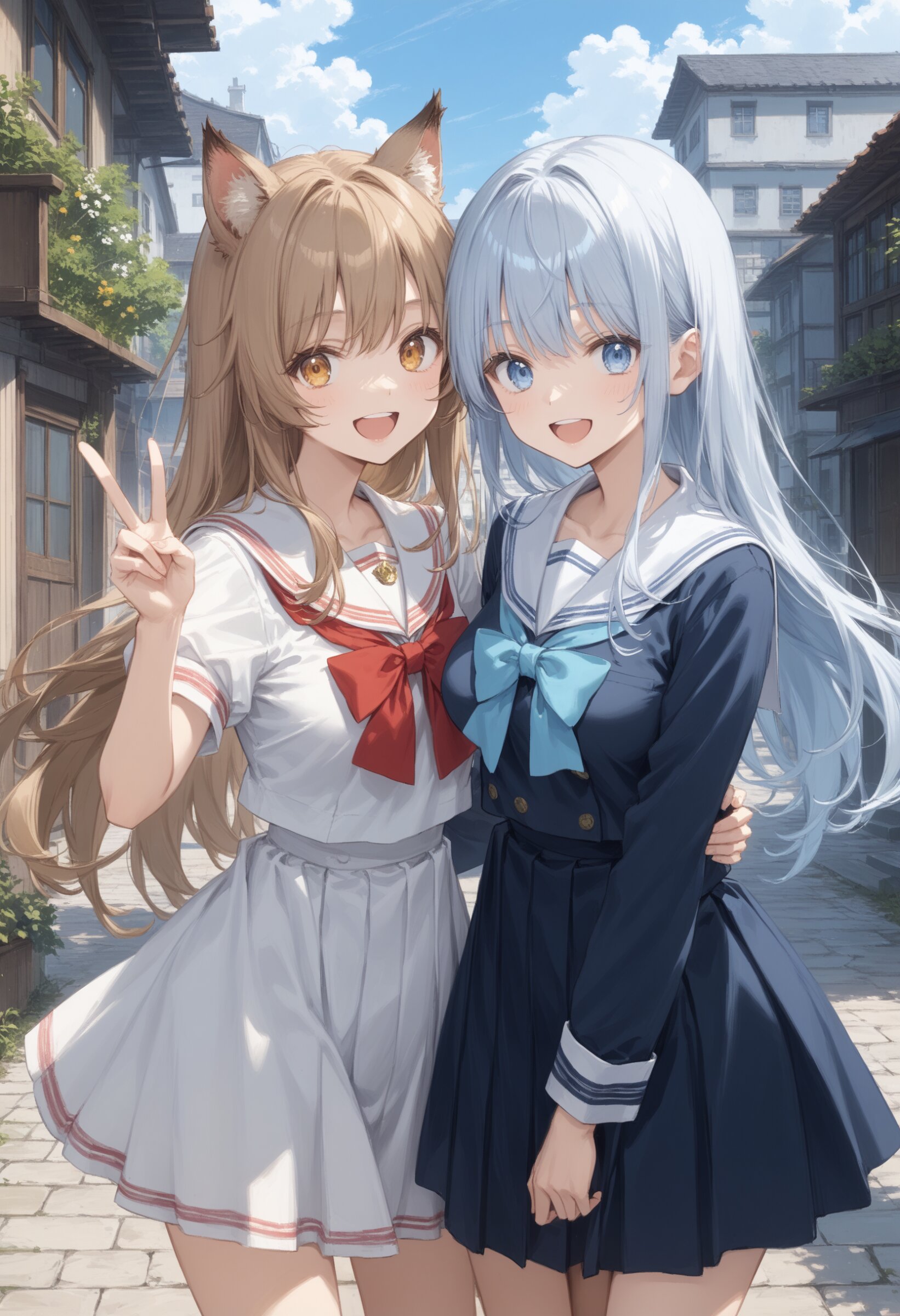 score_9,score_8_up,score_7_up,source anime,best quality,masterpiece,8k,extremely detailed CG unity 8k wallpaper,Slightly_open_mouth,sailor,smile,serafuku,medium breasts,2girls,(v:1.2), ADDBASE, 2girls,light brown hair,long hair,amber eyes,wild boar's ears,(v:1.2), ADDCOL, 2girls,(silver long hair:1.1),light blue eyes,(v:1.2),