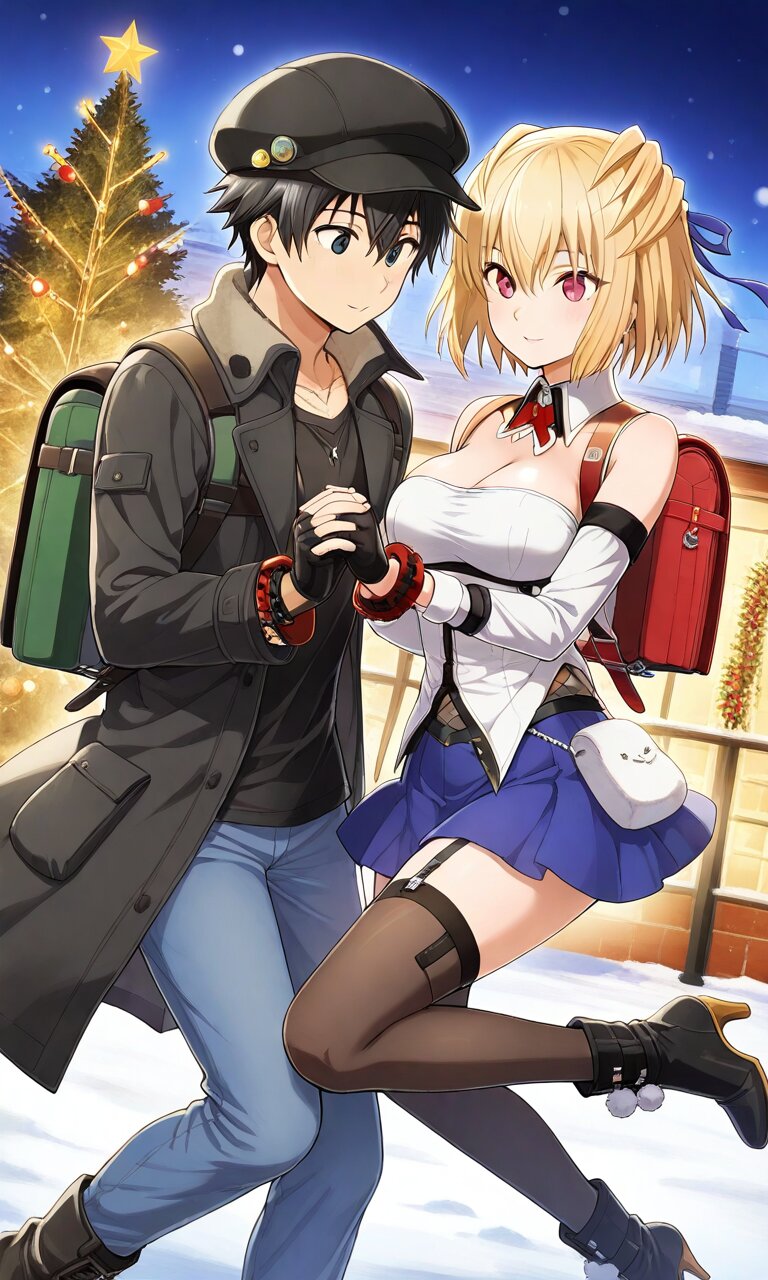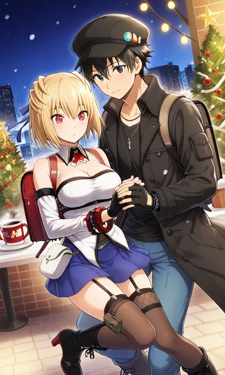 Couple, boy and girl, two people only,absurdres, ultra-detailed, master piece, high resolution, 8k, Boy, girl, couple,Cozy café, couple holding hands, Christmas lights, hot chocolate mugs, snow outside BREAK the boy(original boy,black hair,black eyes, Black long trench coat and hat,black shirt , black boots) BREAK the girl(Claire Victorious, red eyes, short hair, blonde hair, red bracelet, large breaths Defaultclaire, hair ribbon, detached collar, cleavage, shirt, bare shoulders, detached sleeves, fingerless gloves, backpack, blue skirt, hip pouch, thighhighs, garter strap, fishnets, high heels,)