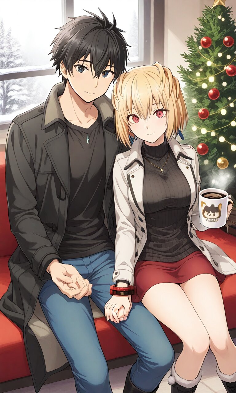 Couple, boy and girl, two people only,absurdres, ultra-detailed, master piece, high resolution, 8k, Boy, girl, couple,Cozy café, couple holding hands, Christmas lights, hot chocolate mugs, snow outside BREAK the boy(original boy,black hair,black eyes, Black long trench coat and hat,black shirt , black boots) BREAK the girl(Claire Victorious, red eyes, short hair, blonde hair, red bracelet, large breaths)