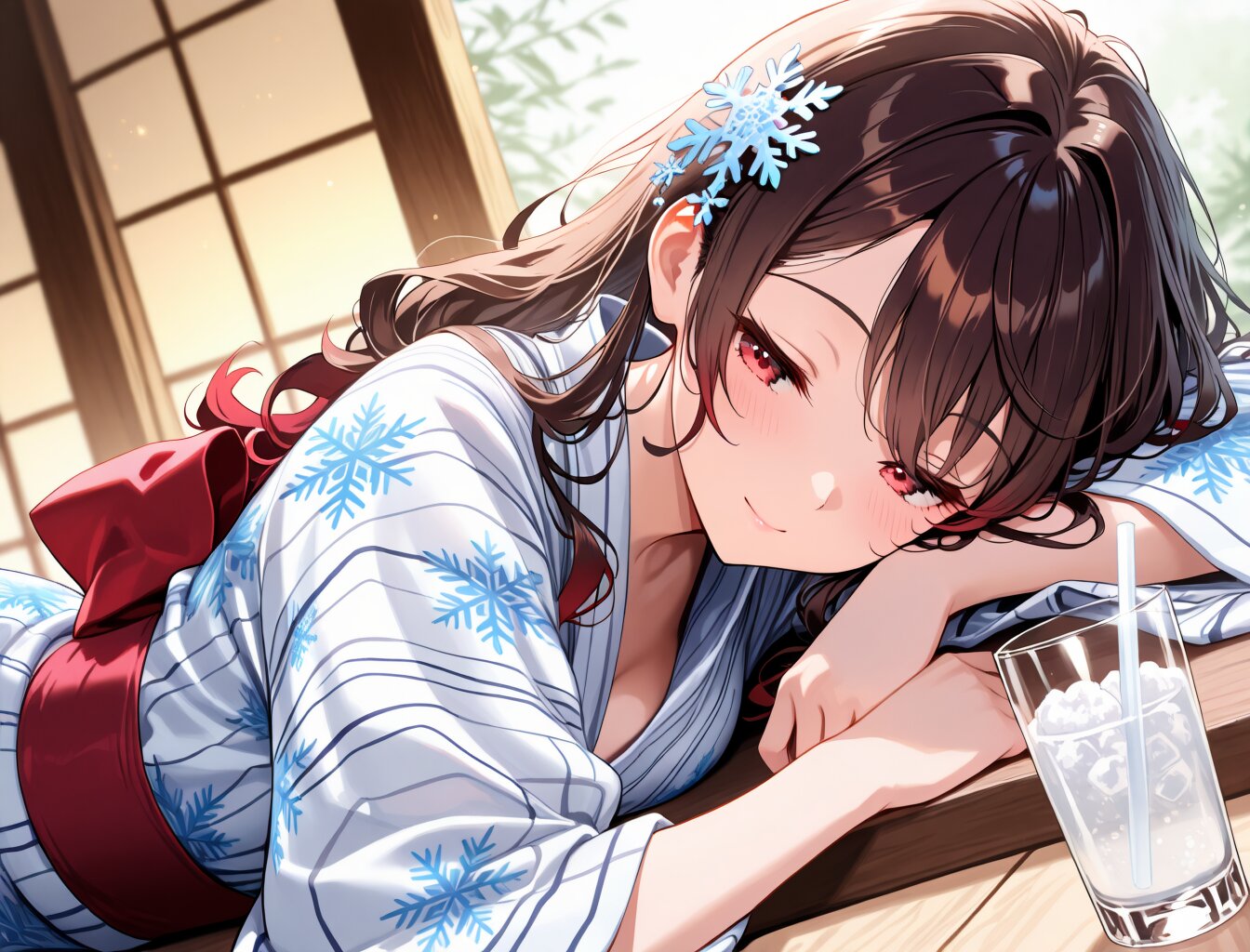 masterpiece,best quality,ultra detailed,dark brown hair,red tips,red bow,wavy hair,long hair,red eyes,seductive_smile,snowflake_hair_ornament,yukata,glass drink,straw,white drink,sleeping,