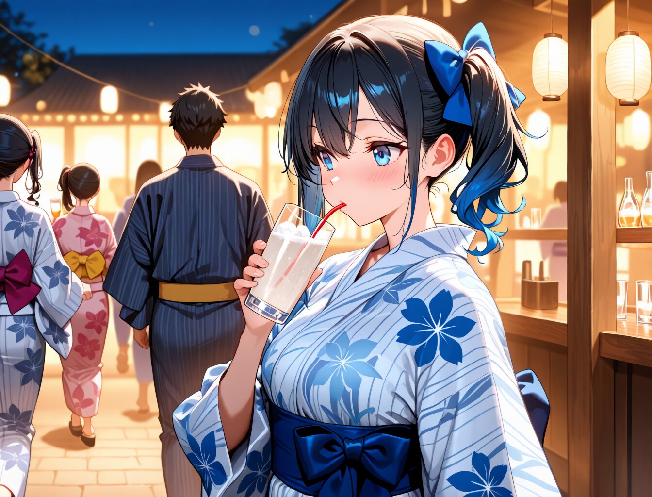 masterpiece,best quality,ultra detailed,black hair,blue tips,(Side ponytail:1.2),blue eyes,blue bow,yukata,glass drink,white drink,drinking,walking,