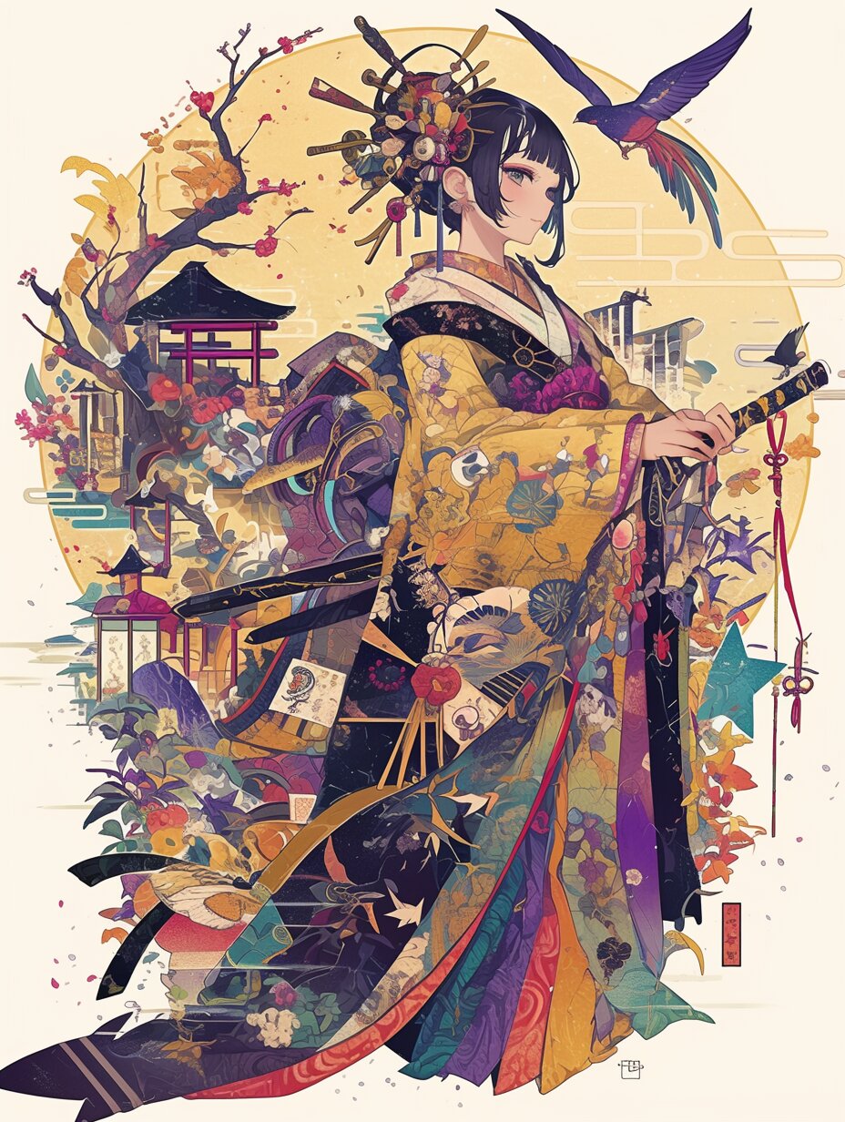 彼女の着物は、四季の花々と神々の象徴が縫い込まれた“霊装”であり、