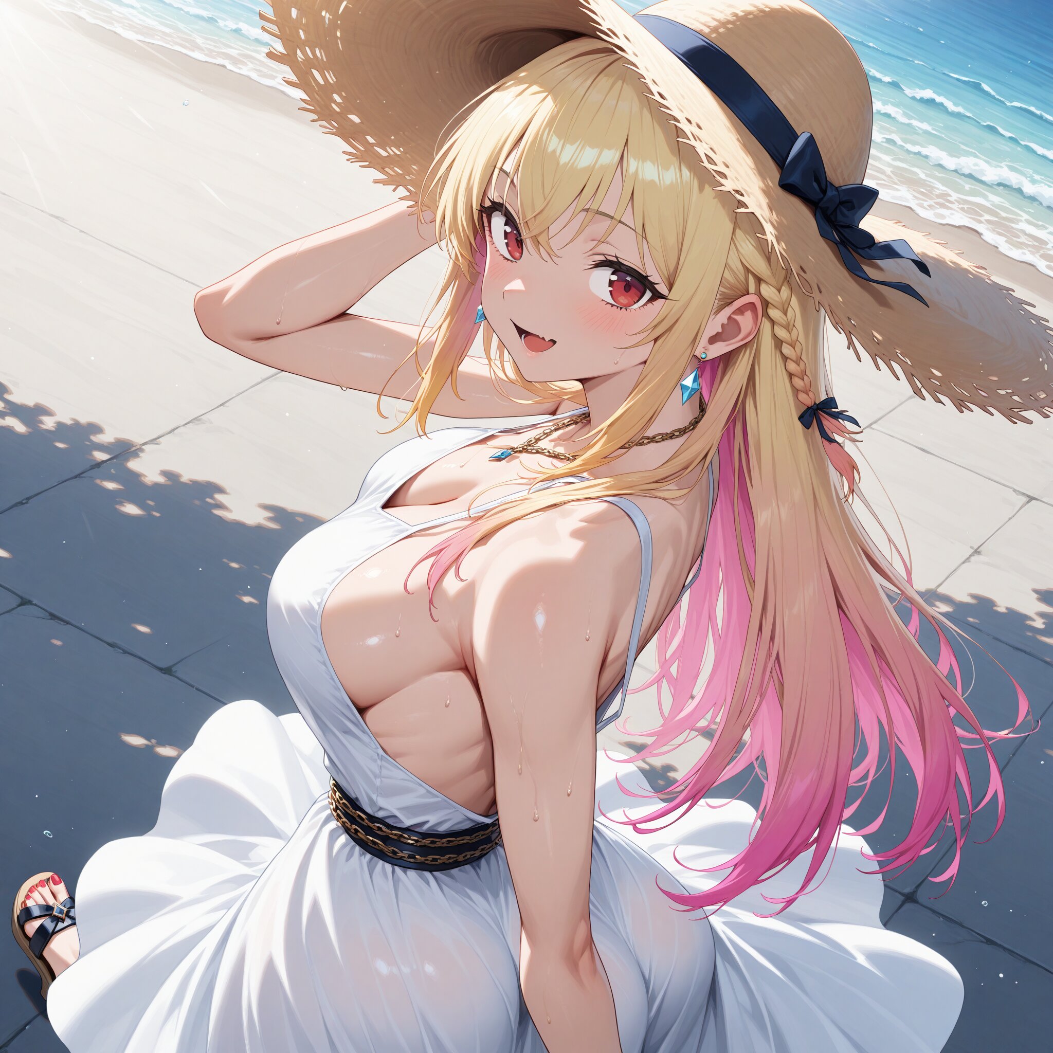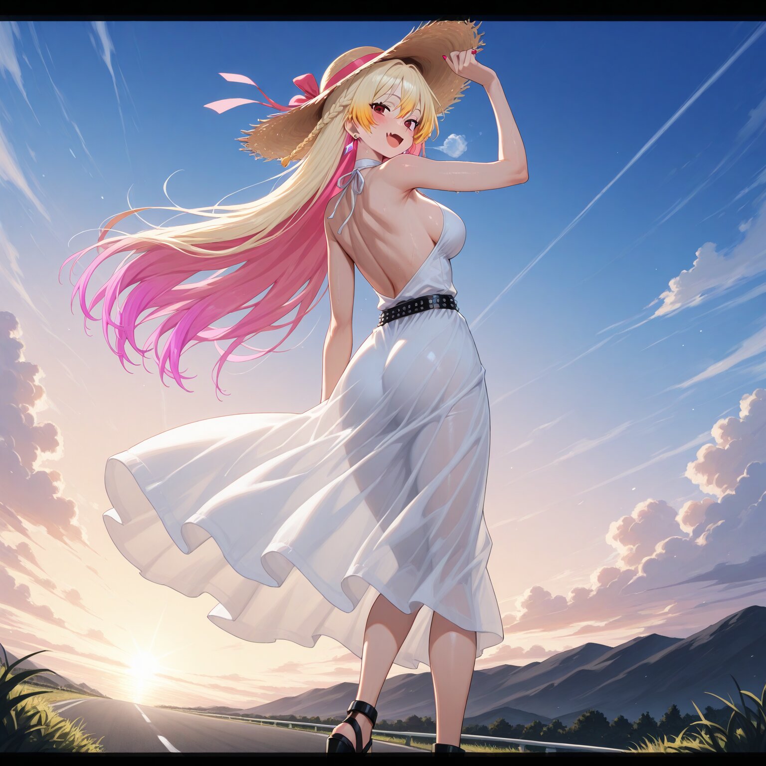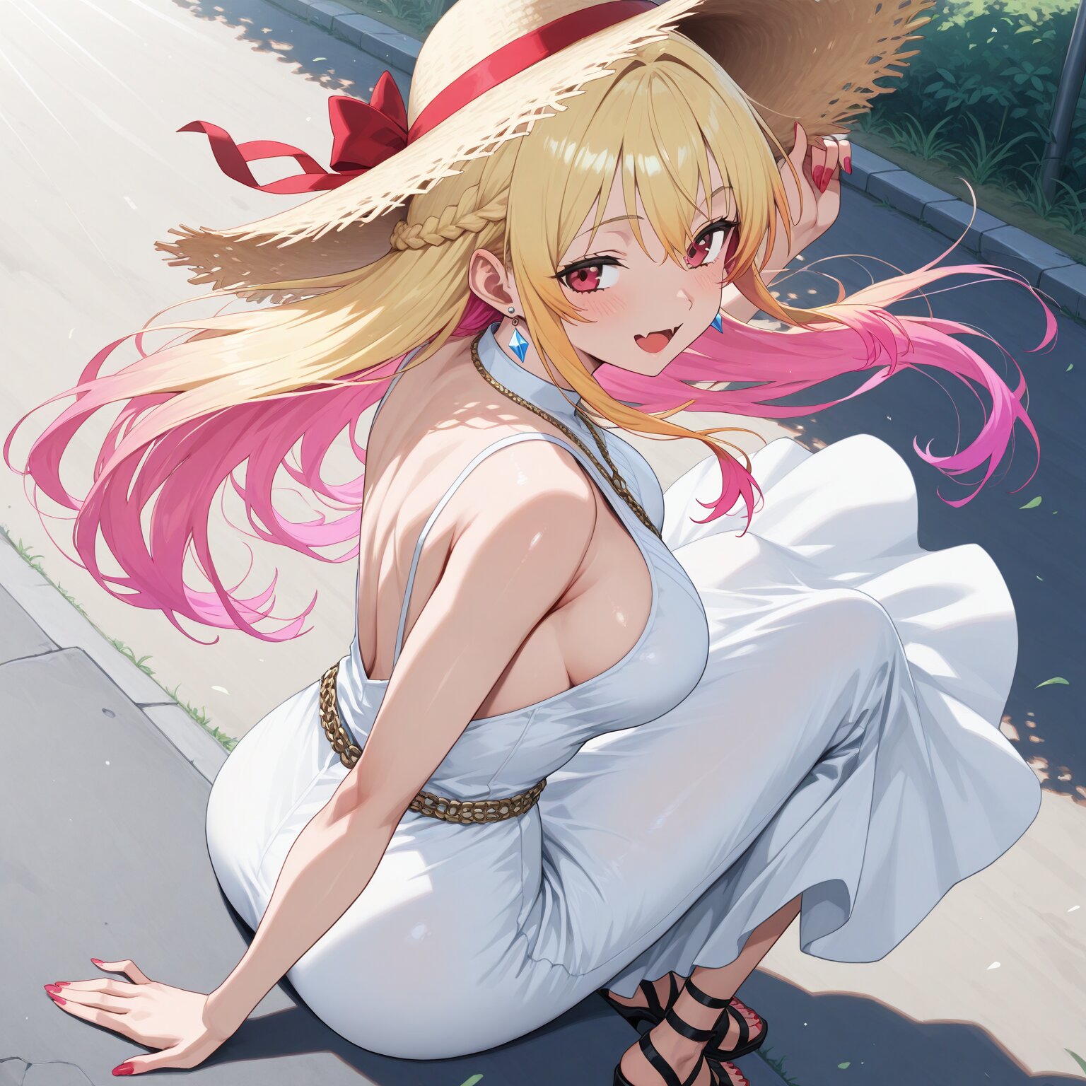 (1woman), BREAK, BREAK, (((blond long hair, Straight Hair:1.5))), ((sharp bangs:1.3 )),((Long sideburns)),(((red eyes))), (slanted eyes), slender, (sweat:0.8), shiny body, shiny skin, (full breasts:1.3), Tight, tight waist, toned body, muscular abs, abs, muscular BREAK, ((diamond-shaped earrings)), chain belts, chains, chain accessories, (((pink inner hair, gradient hair from blond to pink:1.6))), skin fangs, Long nails, red nail polish, gorgeous nail polish, pubic hair BREAK, Straw hat, white dress, sandals, high heels Sleeveless, bare back, braids Wind blowing, hair fluttering in the air, skirt fluttering in the wind Angle from behind, back view, looking back, smiling, hand on hat Southern island, outdoors, daytime, sunlight, road with sea view, BREAK, ((newest, year 2024, anime, animation, anime screen capture, anime style:1.3)) BREAK, ((masterpiece, , vibrant, very aesthetic, highly detailed, best quality, 16k:1.3)) Perfect hands, perfect fingers,