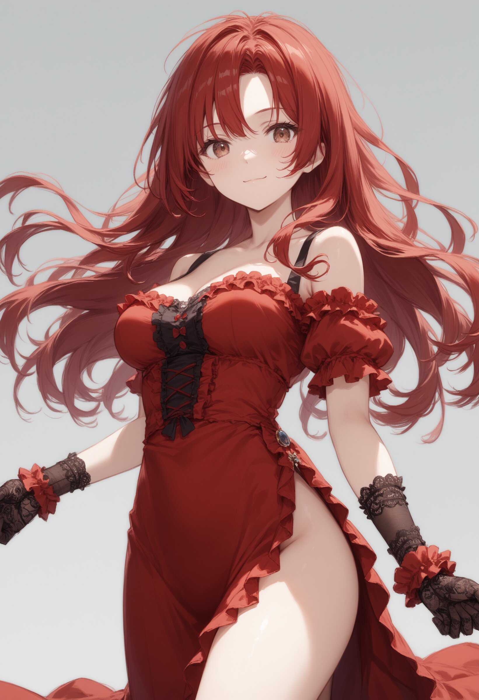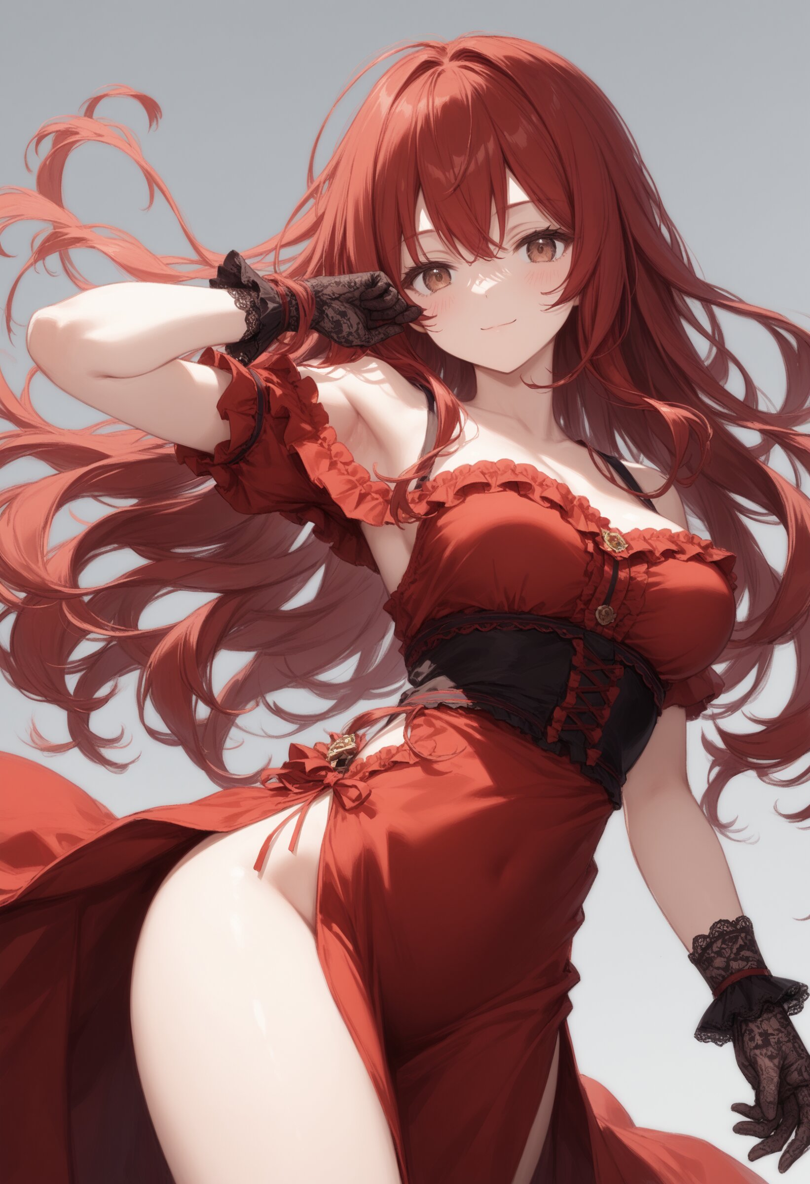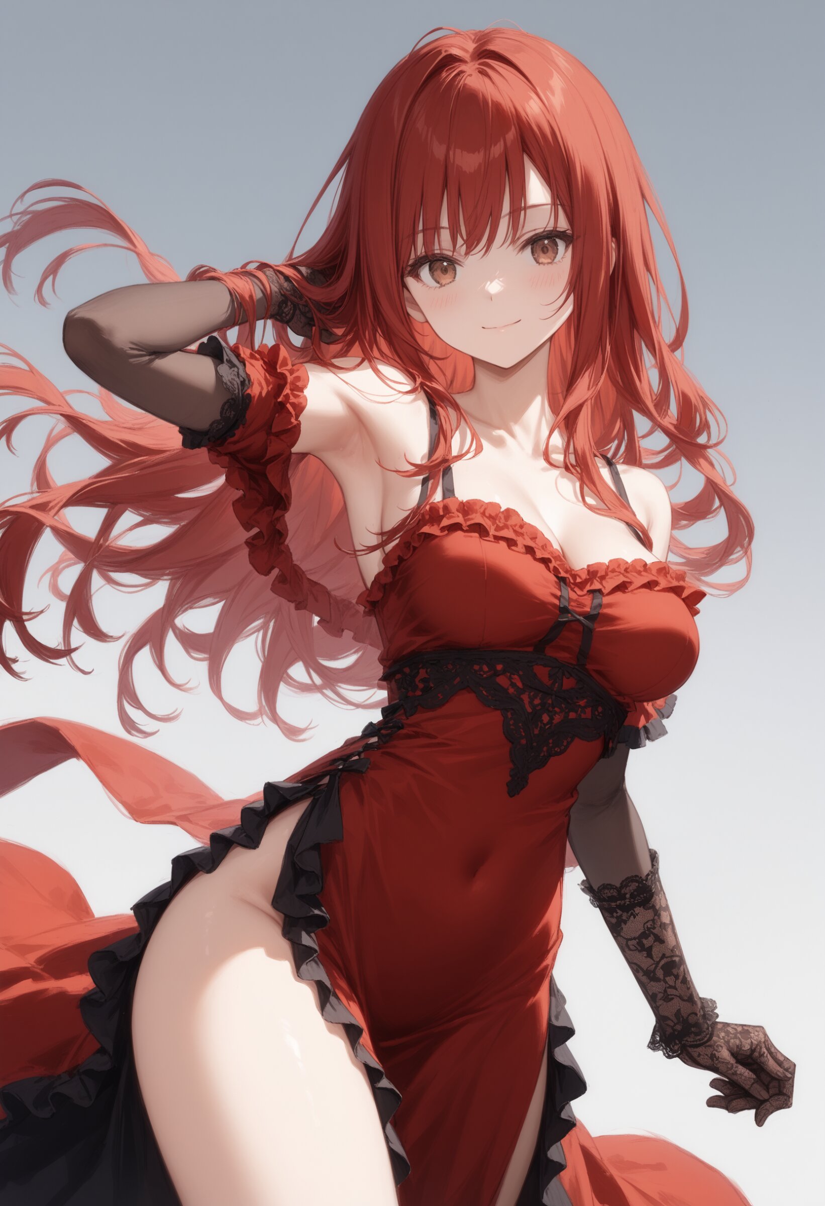 score_9,score_8_up,score_7_up,source anime,best quality,masterpiece,8k,extremely detailed CG unity 8k wallpaper,medium breasts,face_focus,(dynamic_angle:1.2),(red hair:1.3),(dark red long hair:1.3),looking_at_viewer,red off-shoulder,red frilled dress,(adult:1.2),one side slit,simple_background,grey_background,seductive_smile,blush,(lace gloves:1.1),stylish_pose,curvy pose,armpits,closed mouth,brown eyes,(cowboy_shot:1.1),legs,asymmetrical_clothes,