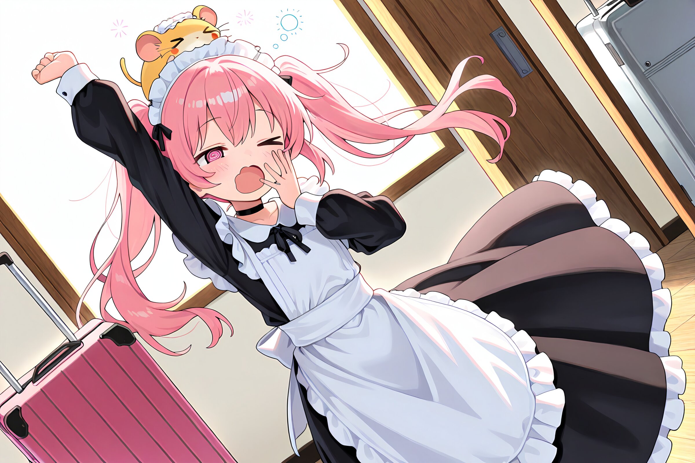 1 little girl, solo, diagonal angle, masterpiece, best quality, amazing quality, very aesthetic, pink hair, twintails, pink eyes, =_=, @_@, sleepy, squeans, spoken squeans, yawning, stretching, choker, maid outfit, long skirt, huge rolling suitcase, hamsters on head, > <, morning,