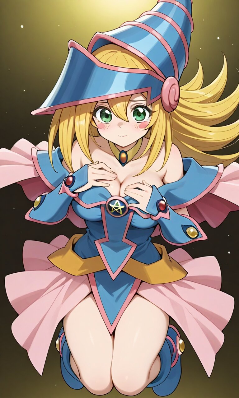 dark magician girl, blonde hair, green eyes, long hair, blush, blush stickers, breasts, anime screencap best quality}, {very aesthetic}, {ultra-detailed}, {best illustration} nsfw, perfect hands, perfect face, perfect eyes, perfect light, dynamic light, natural light, full body a japanese comic featuring an attractive girl holding her chest and breasts, 1girl, breasts, solo, breasts, cleavage