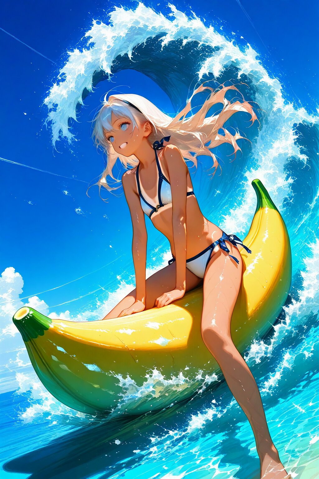(in flat color style illustration), (super dynamic angle from below), diagonal view. 1girl, (light blue eyes, silver long hair, floating hair, bikini, side tie bikini bottom, white bikini with blue strap, ), (full-body shot, waterline split shot:1.3), (bikini tan lines), splash, banana boat floating on water, on the banana boat, bare feet, wave, pipeline, clear waterline boundary, refraction at waterline. (summer illustration, flat colors, ultra-intricate detailed), flat design, bold colors, beautiful composition, in the style of cute anime girl. BREAK insanely beautiful and delicate skin, (exquisitely wet and shiny hair, sweat), beautiful small face, big round eyes, long eyelashes, double eyelids, parted lips, smile, kawaii, cute, flat chest, slender, {exquisitely detailed clothes}, perfect anatomy, beautiful legs, perfect feet, (dynamic angle, dynamic pose), BREAK (masterpiece, aesthetic quality, 8K, ultra-detailed), (perfect design, realistic complex), absurdres, highres, hyperrealistic, photorealistic, realistic lighting,