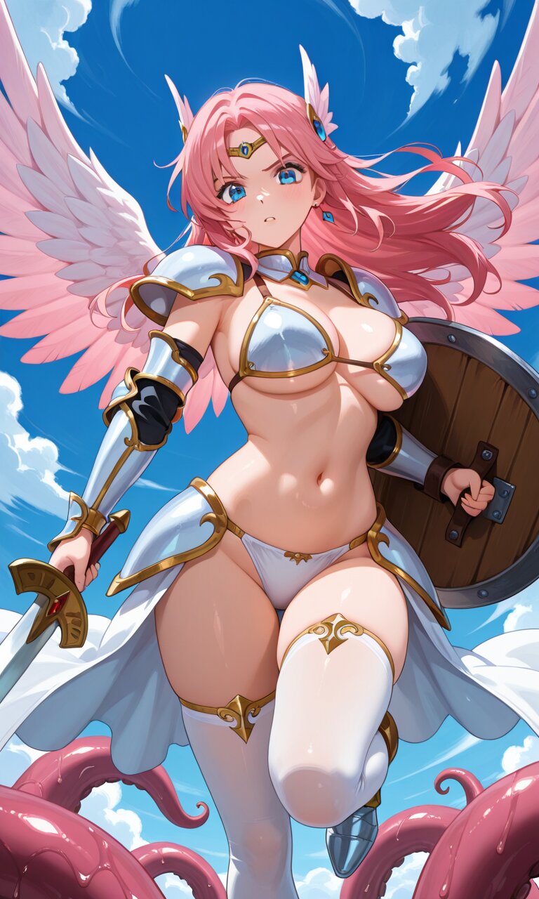 female anime character in her pink wings, 1girl, breasts, pink hair, blue eyes,solo, thighhighs, white wings, long hair, large point breasts, navel, white thighhighs, looking at viewer,white bikini Armor, hair jewelry, earrings, white armor panties,fighting tentacles,flying, Dynamic scene,hold SWORD and SHIELD,wind