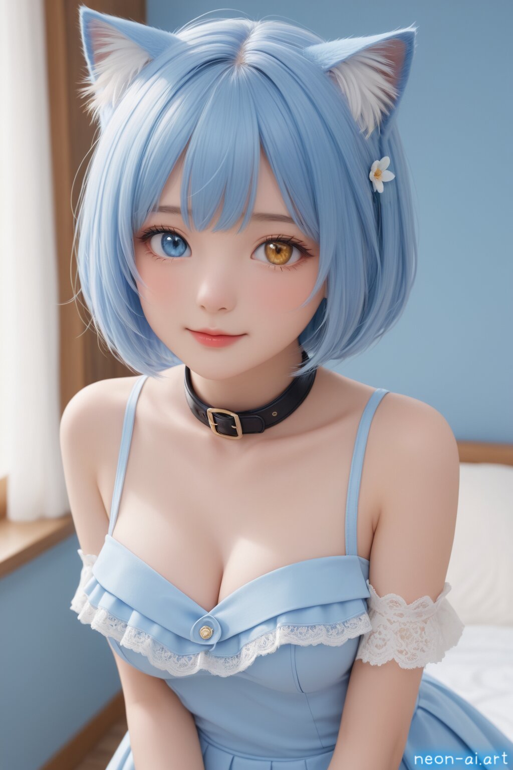 detailed clothing, accessories, wearing a two-piece set, detailed lace of pale blue light blue, halter top with a cowl neckline, ruched detail on the chest, layered ruffled mini skirt, detailed skin texture, pale blue background neutral color palette with textured backdrop, slight soft lighting, indoor,