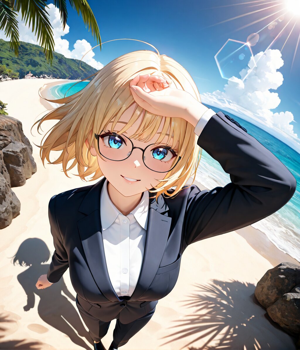 masterpiece, best quality, amazing quality, 4k, very aesthetic, high resolution, ultra-detailed, absurdres, newest, scenery, 3d, rendered, backlit, 1girl, solo,collared shirt, pants, white shirt, suit, glasses, blonde hair, short hair, choppy bangs, blue eyes, parted lips, smile, medium breasts, hand on own forehead, head tilt, fisheye, full body, portrait, dutch angle, dynamic, beach, blue sky, island, floating hair, BREAK, hands, fingers, (dappled sunlight, sunburst, lens flare:1.2), vignetting, dramatic shadow, cinematic lighting, rim light, detailed background, depth of field, vignetting, volumetric lighting