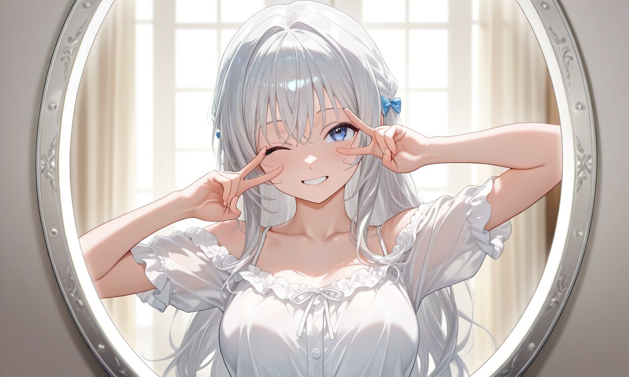 An illustration like a movie poster. A dynamic composition and scene like the last scene of a movie. Official art. A semi-realistic moe heroine in the style of Japanese anime. A girl with long silver hair and blue eyes. Casual indoor clothes. A cute girl's room with a pale pink motif. A smile and wink in front of the mirror. Maximum self-esteem, "I'm cute today too!". v over eyes, bare neck, medium breast, <lora:elf-san alpha1:0.7> <lora:elf-san alpha4(IL1.0):0.7>, score_9, score_8_up, score_7_up, source_anime, masterpiece, amazing quality, very aesthetic, high resolution, ultra-detailed, 2d, semi-realistic, moe heroine, sharp focus,, anime style, anime color,