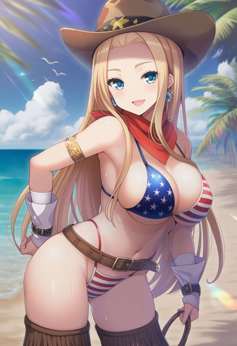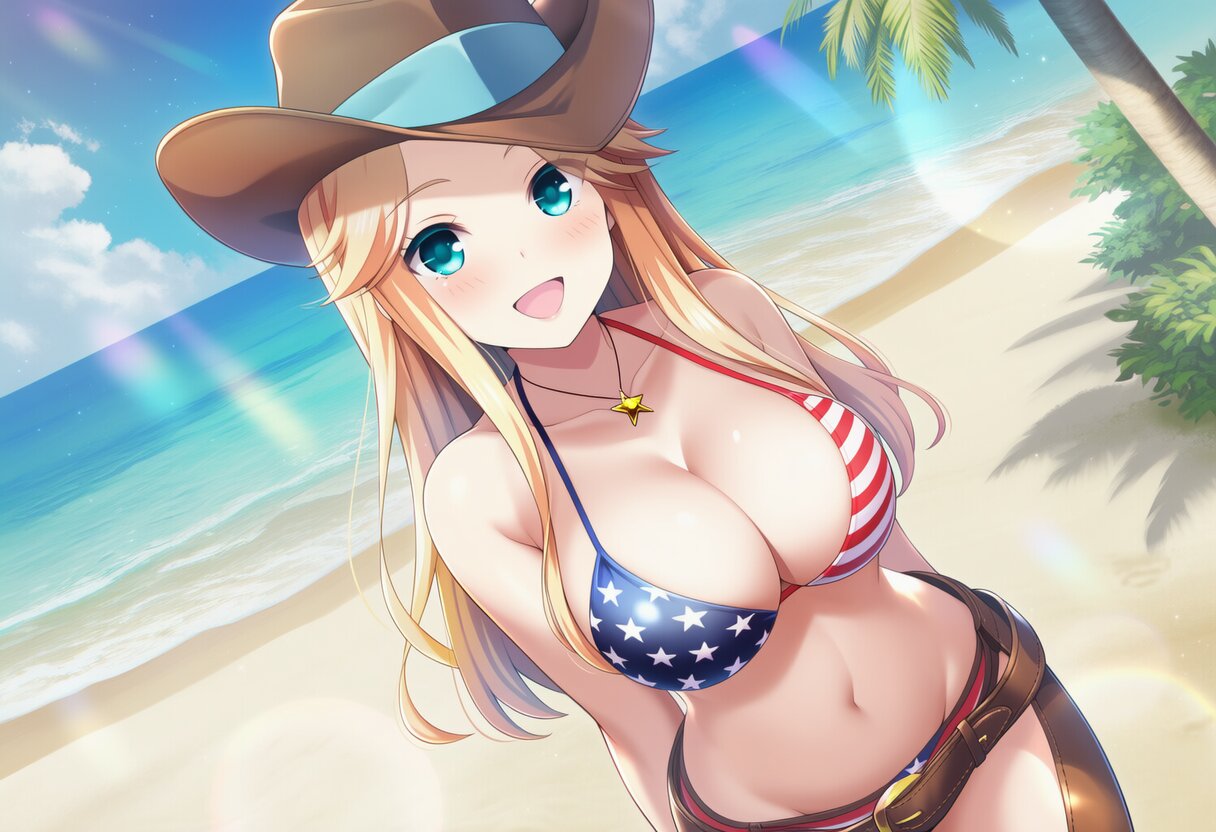 {{{highly detailed}}}, {{official style}}, {{game cg}}, {{intricate}}, {{{detailed beautiful eyes, detailed beautiful face, detailed beautiful face and eyes}}}, 1girl, solo, style of ai-generated, {{tenka hyakken, girlfriend (kari)}}, blue eyes, long hair, straight hair, blonde hair, forehead, large breasts, light smile, happy, open mouth, {{cowboy hat, american flag bikini, long boots}}, sea, sandy beach, blue sky, palm tree, standing, cowboy shot, no animal, {{{masterpiece}}}, {{{best quality}}}, {{{very aesthetic}}}, {{{ultra-detailed}}}, {illustration}, {{{extremely detailed}}}, {{{an extremely delicate and beautiful}}}