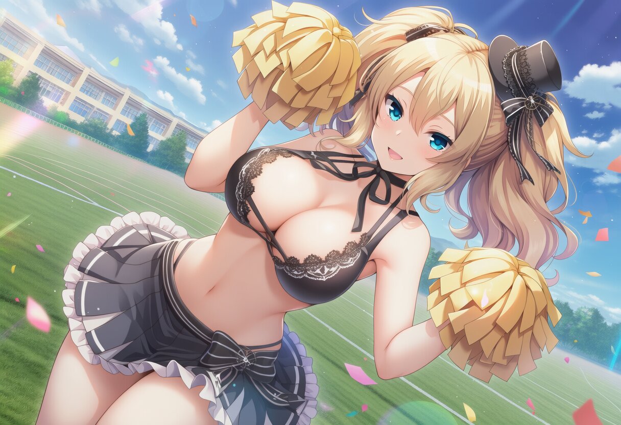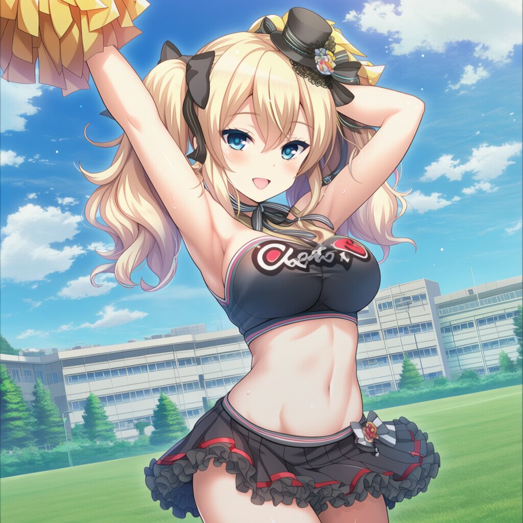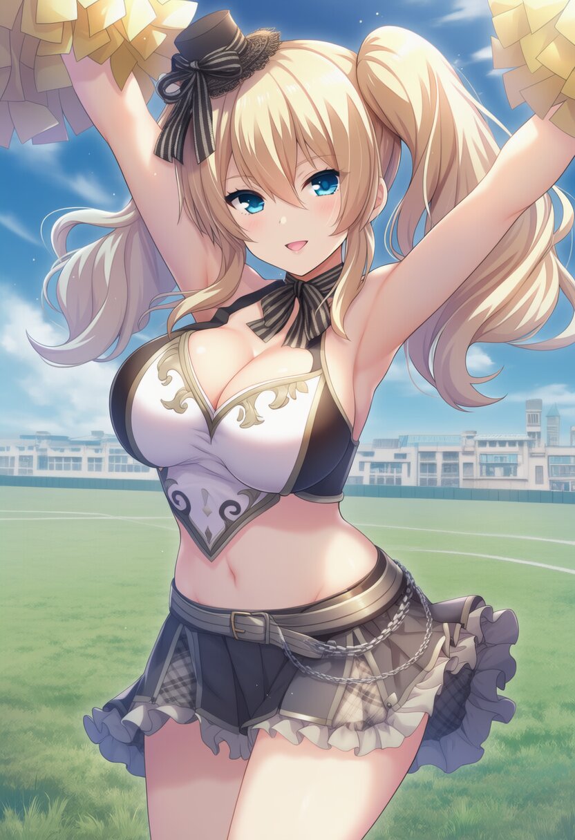 {{{highly detailed}}}, {{official style}}, {{game cg}}, {{intricate}}, {{{detailed beautiful eyes, detailed beautiful face, detailed beautiful face and eyes}}}, 1girl, solo, style of ai-generated, {{tenka hyakken, girlfriend (kari)}}, mature female, blonde hair, medium hair, 0.2::long hair::, messy hair, twintails, big hair, hair between eyes, black ribbon, blue eyes, tsurime, large breasts, light smile, happy, open mouth, navel, {{cheerleader}}, {{gothic & cheerleader costumes}}, {{gothic lolita:1.25}}, frills, black clothes, frilled mini skirt, wear a black lace mini top hat and a large ribbon choker, {{{holding a yellow pompon}}}, {{{arms up}}}, cowboy shot, blue sky, grasslands, school, {{{masterpiece}}}, {{{best quality}}}, {{{very aesthetic}}}, {{{ultra-detailed}}}, {illustration}, {{{extremely detailed}}}, {{{an extremely delicate and beautiful}}}