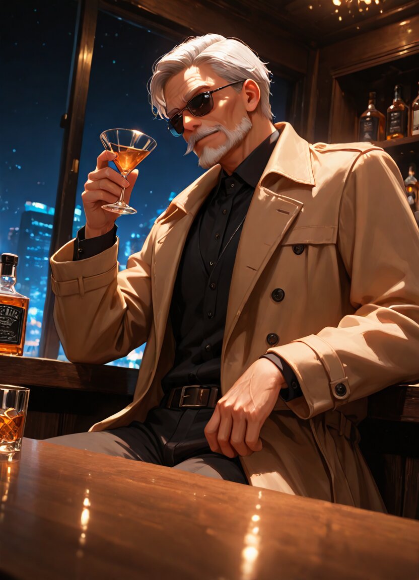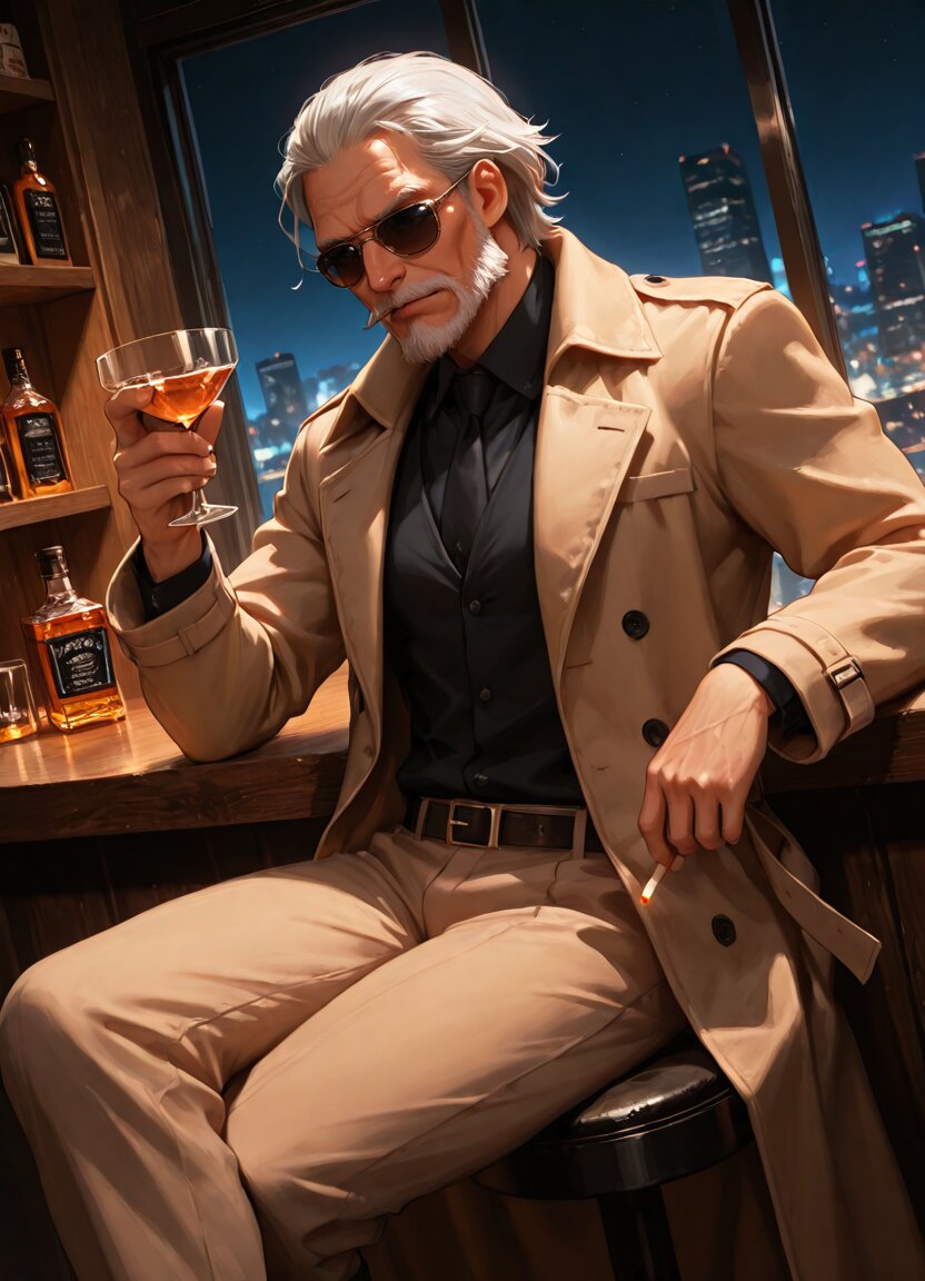 general,1boy,old man,gentleman,silver hair,sunglasses,trench coat,whiskey,cigarettes,sitting_Stools,bar,night,dutch angle,dark_atomosphere,holding cocktail glass,, appropriate posture,appropriate configuration,ideal ratio body proportions,perfect anatomy, <lora:Fixhands_anime_bdsqlsz_V1:1>, masterpiece,best quality,newest,absurdres,highres,ultra high res,8K UHD,hyper-detailed,