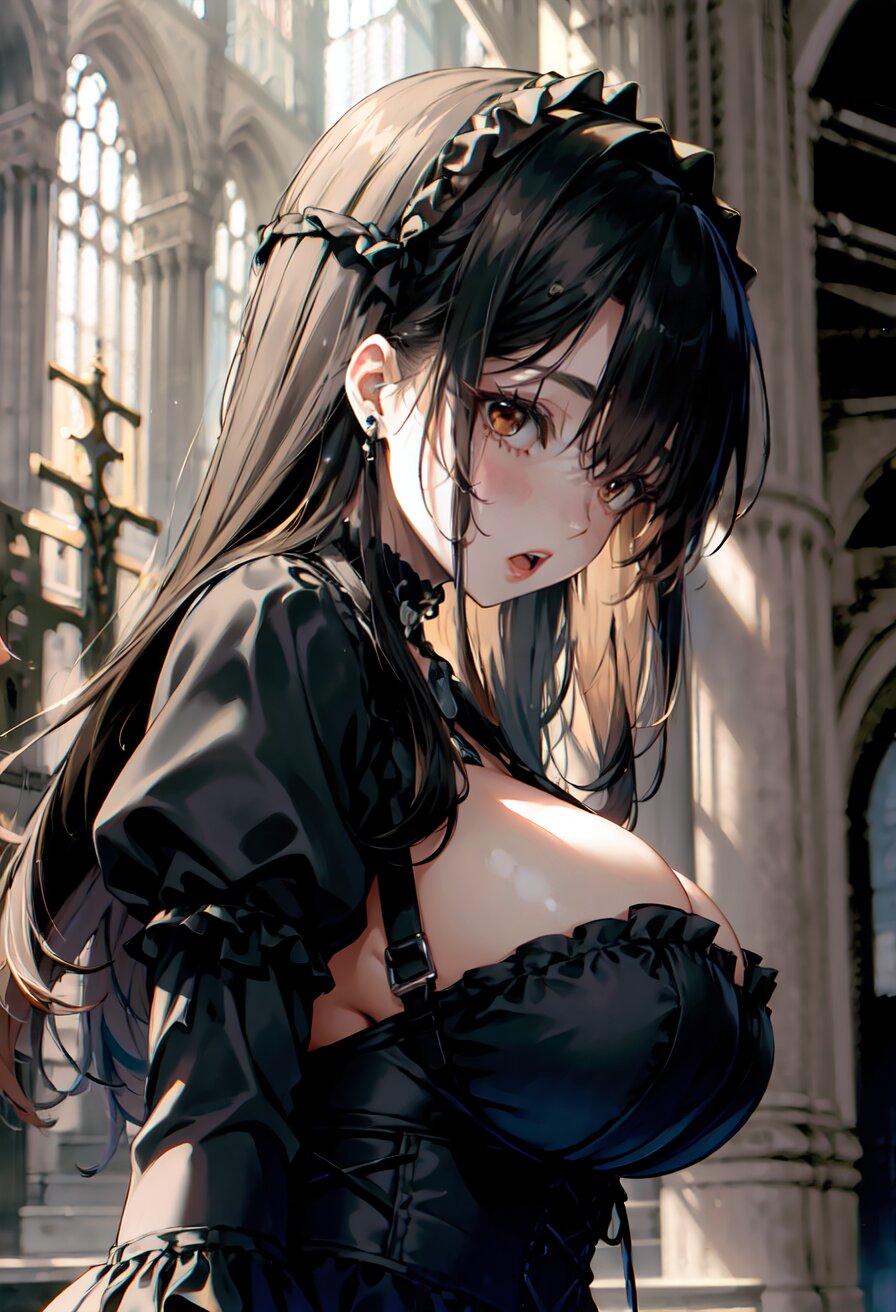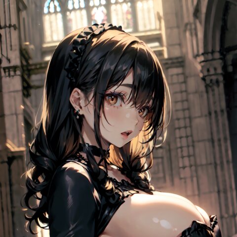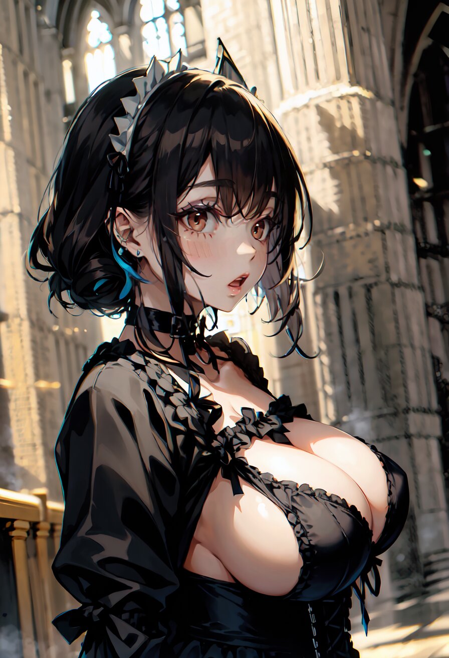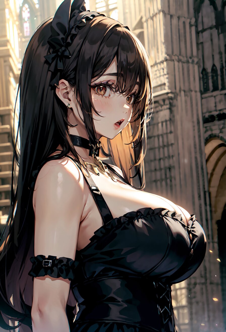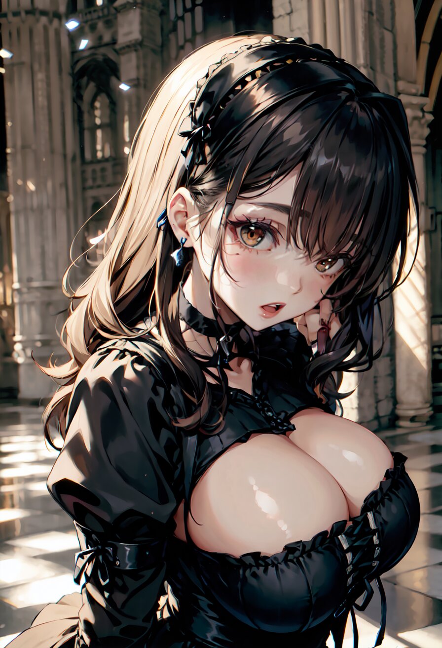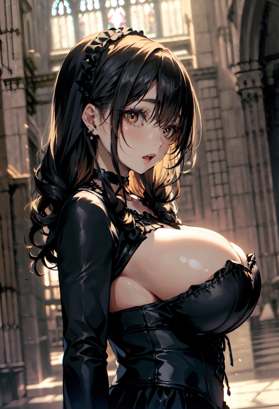(random angle: 1.8), perfect anatomy, (masterpiece:1.3), (best quality:1.3), (ultra-detailed:1.2), 8K, HDR, (incredibly absurdres:1.2), (vibrant color:1.2), 1girl, 16 years old, (gothic lolita fashion, choker, : 1.6), (plump, gigantic breasts: 1.4), black hair, on back, (upper body, arms behind back: 1.2), huge breasts, (an extremely delicate and beautiful hands), nails, beautiful detailed ears, (intricate detail), highly detailed, beautiful detailed eyes, beautiful detailed glow, detailed light, shiny skin, shiny hair, ( in the gothic cathedral: 1.6), <lora:arisa_v01:0.8>