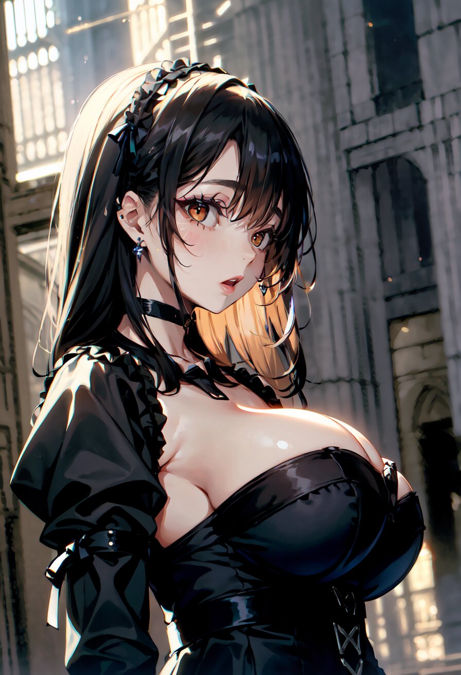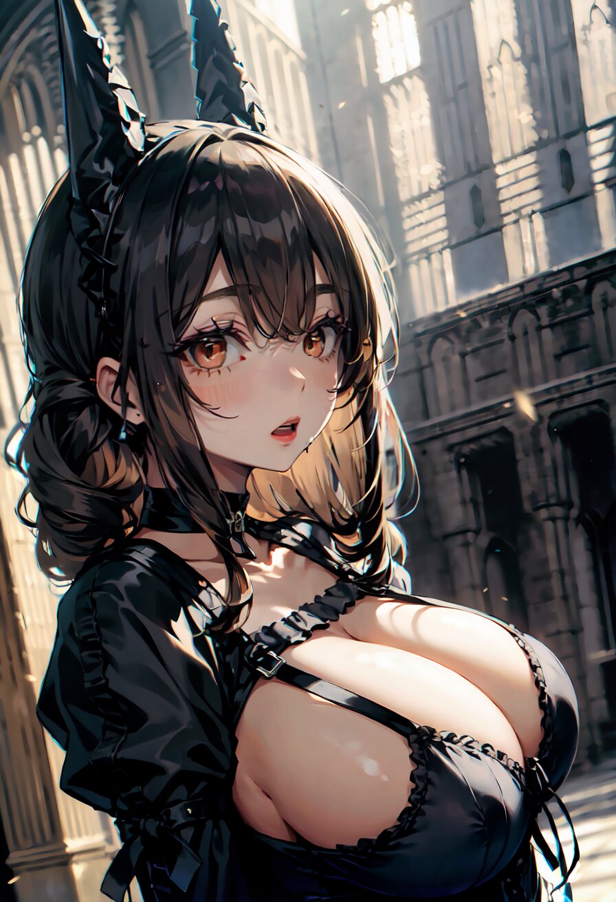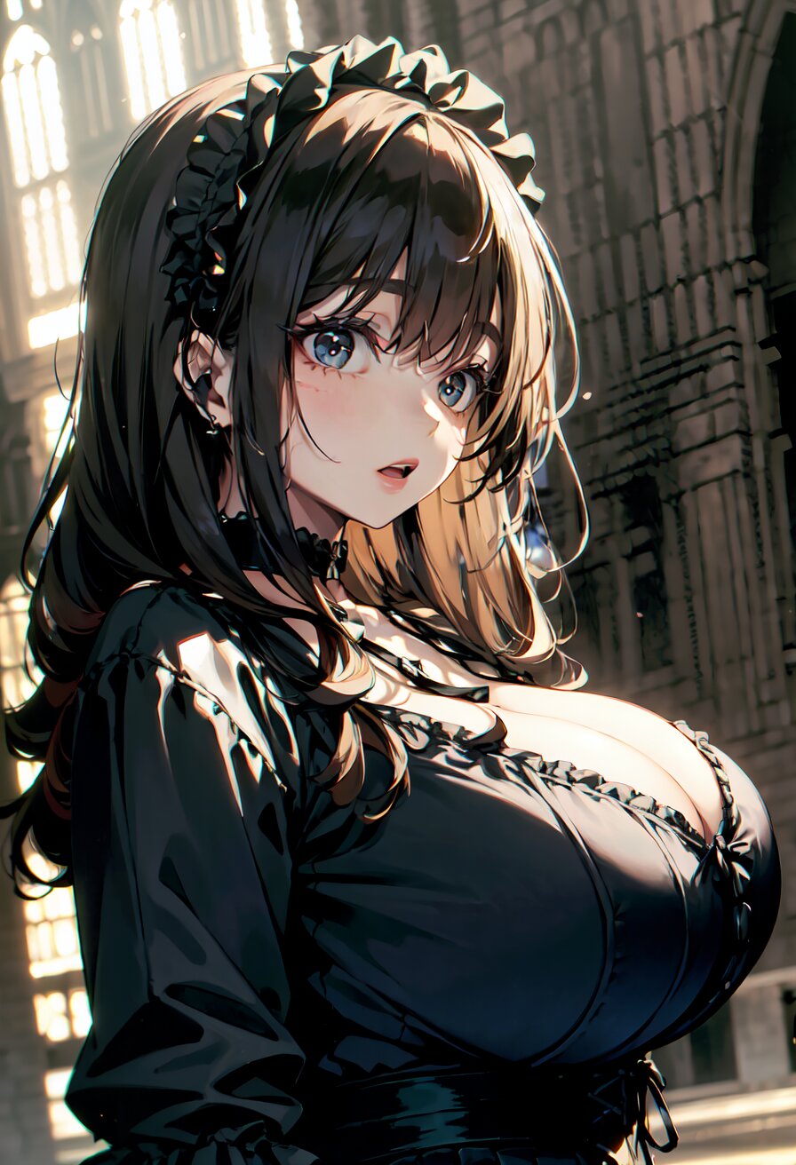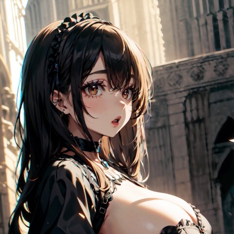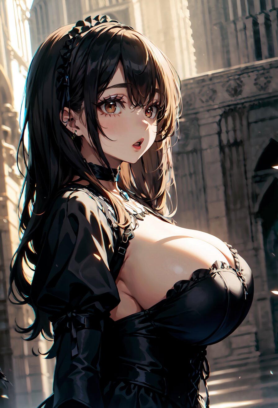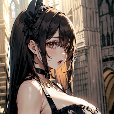 (random angle: 1.8), perfect anatomy, (masterpiece:1.3), (best quality:1.3), (ultra-detailed:1.2), 8K, HDR, (incredibly absurdres:1.2), (vibrant color:1.2), 1girl, 16 years old, (gothic lolita fashion, choker, : 1.6), (plump, gigantic breasts: 1.4), black hair, on back, (upper body, arms behind back: 1.2), huge breasts, (an extremely delicate and beautiful hands), nails, beautiful detailed ears, (intricate detail), highly detailed, beautiful detailed eyes, beautiful detailed glow, detailed light, shiny skin, shiny hair, ( in the gothic cathedral: 1.6), <lora:arisa_v01:0.8>