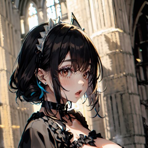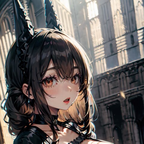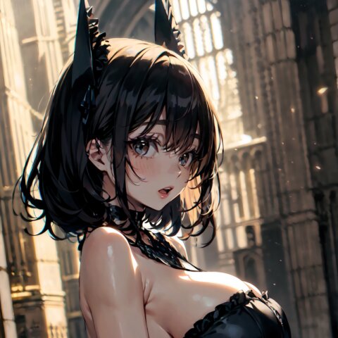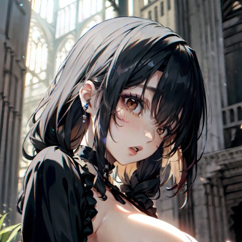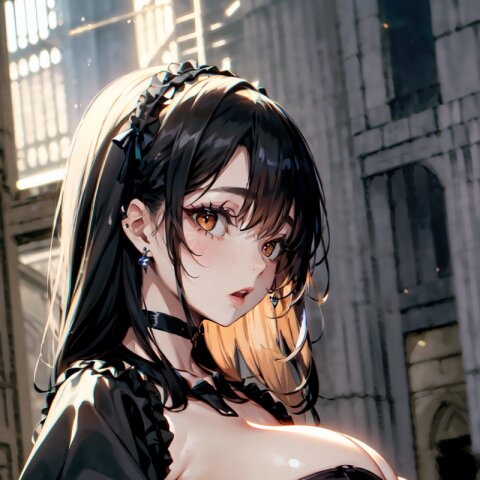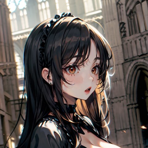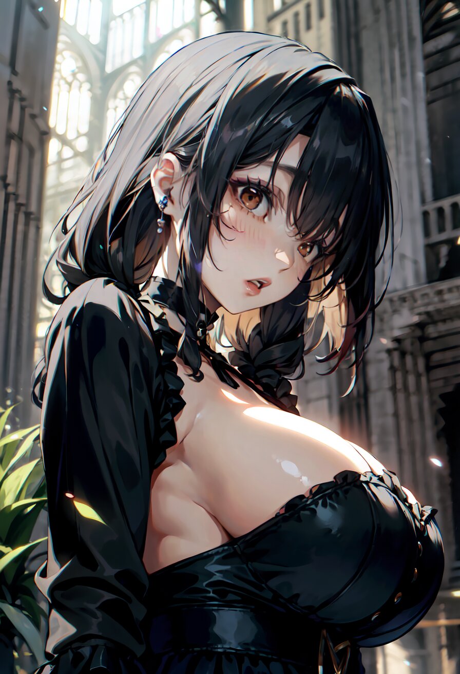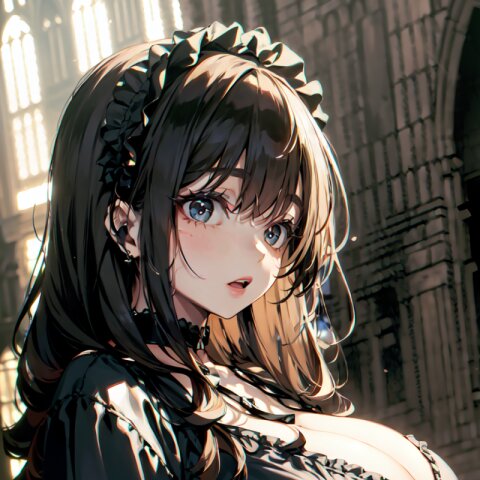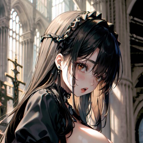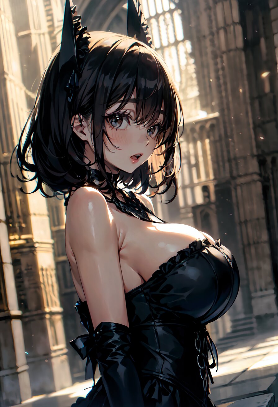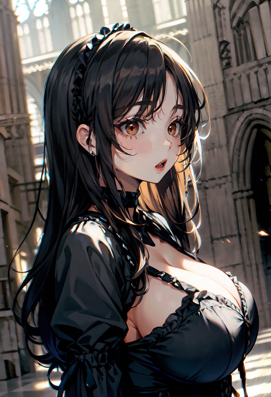 (random angle: 1.8), perfect anatomy, (masterpiece:1.3), (best quality:1.3), (ultra-detailed:1.2), 8K, HDR, (incredibly absurdres:1.2), (vibrant color:1.2), 1girl, 16 years old, (gothic lolita fashion, choker, : 1.6), (plump, gigantic breasts: 1.4), black hair, on back, (upper body, arms behind back: 1.2), huge breasts, (an extremely delicate and beautiful hands), nails, beautiful detailed ears, (intricate detail), highly detailed, beautiful detailed eyes, beautiful detailed glow, detailed light, shiny skin, shiny hair, ( in the gothic cathedral: 1.6), <lora:arisa_v01:0.8>