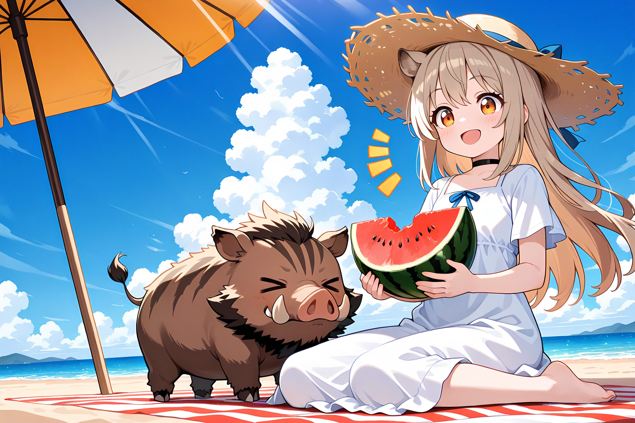 1 little girl, solo, diagonal angle, masterpiece, best quality, amazing quality, very aesthetic, light brown hair, long hair, amber eyes, (wild boar's ears:1.2), happy smile, open mouth, cheerful, notice lines, +++, choker, white sundress, short sleeves, long skirt, straw hat, holding watermelon, wild boar, >_<, wariza, wind, beach, sea, sunbeam, sunshine, cumulonimbus cloud, beach umbrella,