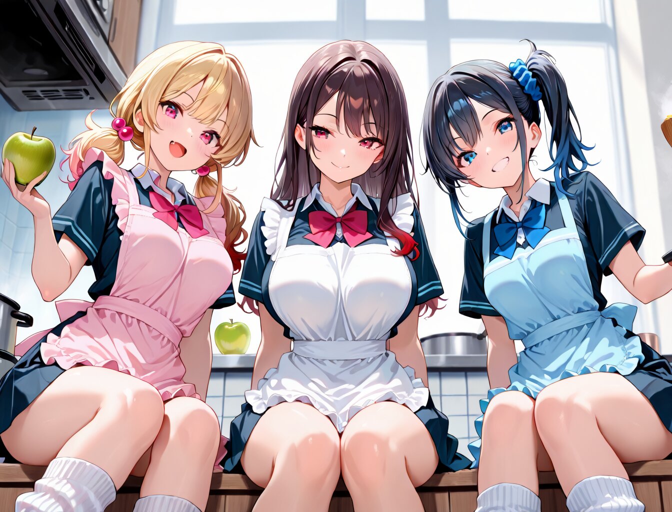 masterpiece,best quality,ultra detailed,(3girls:1.3), AND masterpiece,best quality,ultra detailed,(3girls:1.3),blonde hair,pink tips,pink bow,hair_bobbles,bob cut,(low twintails:1.2),(short twintails:1.2),pink eyes,fang,school uniform,short sleeve,loose socks,beautiful legs,beautiful thigh,frilled apron,cooking,green apple AND masterpiece,best quality,ultra detailed,(3girls:1.3),dark brown hair,red tips,red bow,wavy hair,long hair,red eyes,big breast,seductive_smile,snowflake_hair_ornament,school uniform,short sleeve,loose socks,beautiful legs,beautiful thigh,frilled apron,cooking,green apple AND masterpiece,best quality,ultra detailed,(3girls:1.3),black hair,blue tips,(Side ponytail:1.2),blue eyes,blue bow,blue_scrunchie,grin,school uniform,short sleeve,loose socks,beautiful legs,beautiful thigh,frilled apron,cooking,green apple