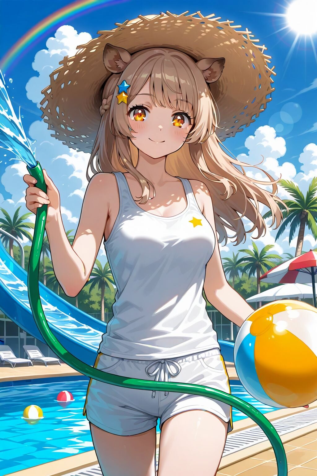 pool scene with a water slide, vibrant water slide curving down into the pool, clear blue water, sunlight sparkling on the surface, colorful tiles, parasols along the poolside, palm trees, white clouds, light brown hair, long hair, amber eyes, wild boar's ears, girl focus, upper body, beach chair, poolside, Beach chairs on the ground, 1girl, Walking, shorts, tank top, straw hat, holding hose, 1girl, bangs, beachball, , blue sky, blush, braid, cloud, cloudy sky, day, hair ornament, lens flare, , long hair, looking at viewer, medium breasts, outdoors, pool, poolside, , rainbow, shirt, , short shorts, shorts, sky, smile, solo, star \(symbol\), star hair ornament, star print, , summer, sun, sunlight, white shirt, white shorts,
