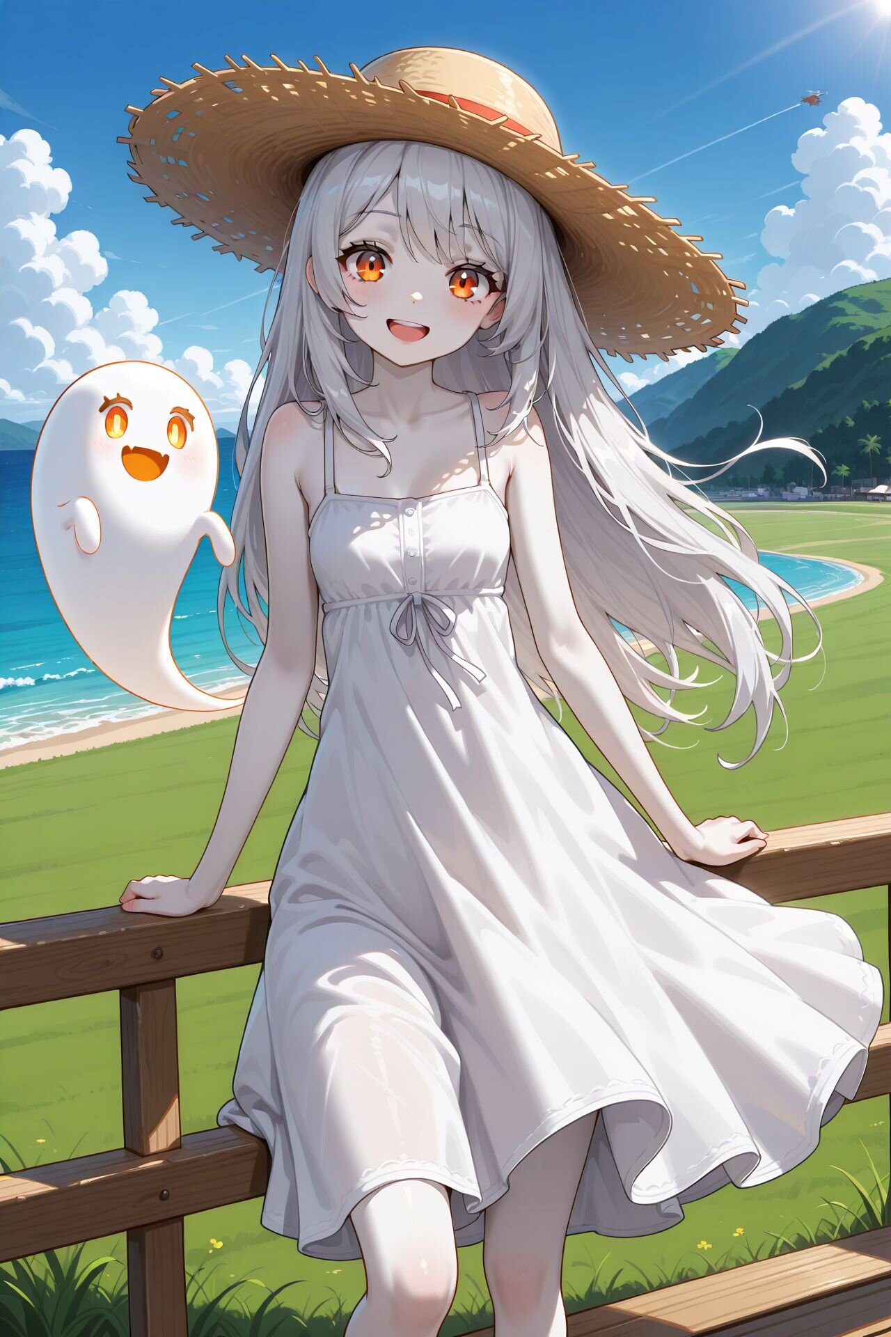 ghost girl, silver hair, long hair, pale skin, orange eyes, day, 1girl, , , , , happy, , looking at viewer, straw hat, white dress, cute ghost, masterpiece, great score, high score, absurdres, highly detailed, AddXL, , vacation,