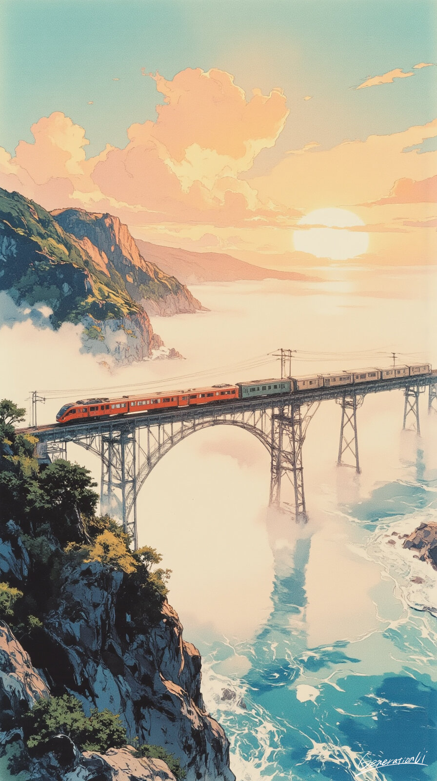朝焼けに染まる空中鉄路/スマホ壁紙アーカイブ Generation UI 2025/7/25使用したAI FLUX.1 年齢制限 全年齢 いいね2 シェア #絶景 #鉄橋 #雲海 #スマホ壁紙 #物語 #オリジナル 【朝焼けに染まる空中鉄路】列車は、まだ覚めきらない世界を切り裂くように走っていた。誰も言葉を交わさないまま、乗客たちは窓の外を見つめている。眼下には、白い雲と泡立つ海。空も海も、朝焼けに染まっていた。列車は何も言わず、ただ東へ。その空中鉄路の先には、もうすぐ今日がやってくる。 プロンプト なし コメント 送信 Generation UI 2023年1月より活動開始 293投稿0フォロー17フォロワー ✨心ときめくスマホ壁紙をAIイラストでお届けします✨ 眺めているだけで、ふと気持ちが動くようなものを目指しています💕 【受賞歴】 ・世界最大級の AI画像生成プラットフォーム Civitai 主催の国際コンテストで受賞 (グレートハロウィンコンテスト2025Gothic Glamour画像部門1位https://civitai.com/articles/22348) フォローする 他の作品 全てを見る レンガ色の午後、風がやさしく通り抜ける街/スマホ壁紙アーカイブ 世界がオレンジに染まるとき/スマホ壁紙アーカイブ ボトルの中を走る小さな鉄道 / スマホ壁紙アーカイブ リビングに舞い降りた空のワンダーランド/スマホ壁紙アーカイブ 灰色の世界でひとつ息をする/スマホ壁紙アーカイブ 荷物より大きな夢を抱えて/スマホ壁紙アーカイブ 極赤の世界にひとつの祈り/スマホ壁紙アーカイブ 石橋のアーチが描く秋の交響曲/スマホ壁紙アーカイブ この雨を切り裂け!/スマホ壁紙アーカイブ 美しき弓、咲き乱れる世界/スマホ壁紙アーカイブ 貴方と過ごす幸せテーブル/スマホ壁紙アーカイブ 読書会はまだ始まらない/スマホ壁紙アーカイブ 物語が動き出す山岳メトロポリス/スマホ壁紙アーカイブ 戦火を纏うエレガンス/スマホ壁紙アーカイブ きのこライトが灯す秘密の谷/スマホ壁紙アーカイブ 木工職人の静かな集中/スマホ壁紙アーカイブ 書棚に挟まれた異世界行き/スマホ壁紙アーカイブ ノスタルジック秋の風景[5]/スマホ壁紙アーカイブ もっと見る
