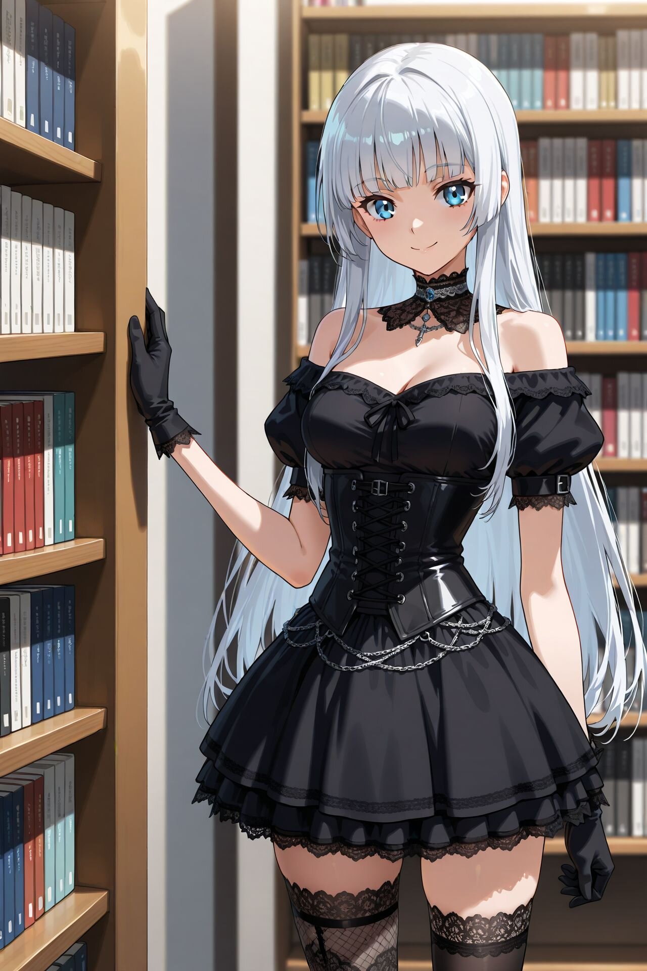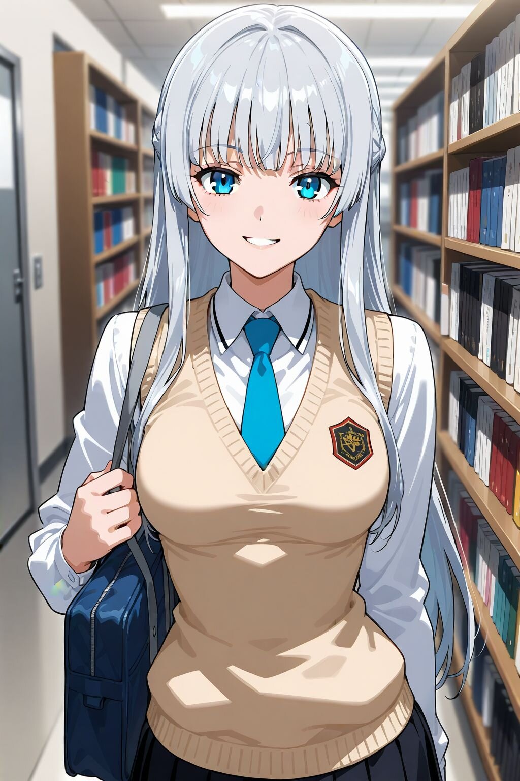 score_9,score_8_up,score_7_up,source anime,best quality,masterpiece,8k,extremely detailed CG unity 8k wallpaper,bookshelf,depth of field,blue eyes,just standing,bishoujo, 1girl,bangs,medium breasts,silver long hair,smile,Slightly_open_mouth,necktie,white_shirt,beige knit vest,school_bag,guide,