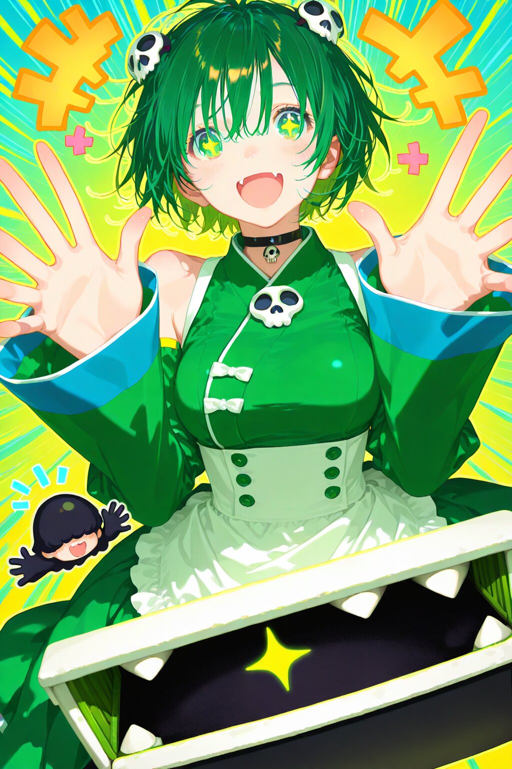 1 girl, (smile, cheer girl), cobalt green hair, short hair, messy hair, (hair over eyes:1.2), green eyes, demon fangs, +_+, open mouch, smile, cheerful, +++, notice lines, choker, green wa maid outfit, (oversized sleeves:1.2), detached sleeves, (floating black ghosty hands:1.2), skull hair ornament, in mimic chest,
