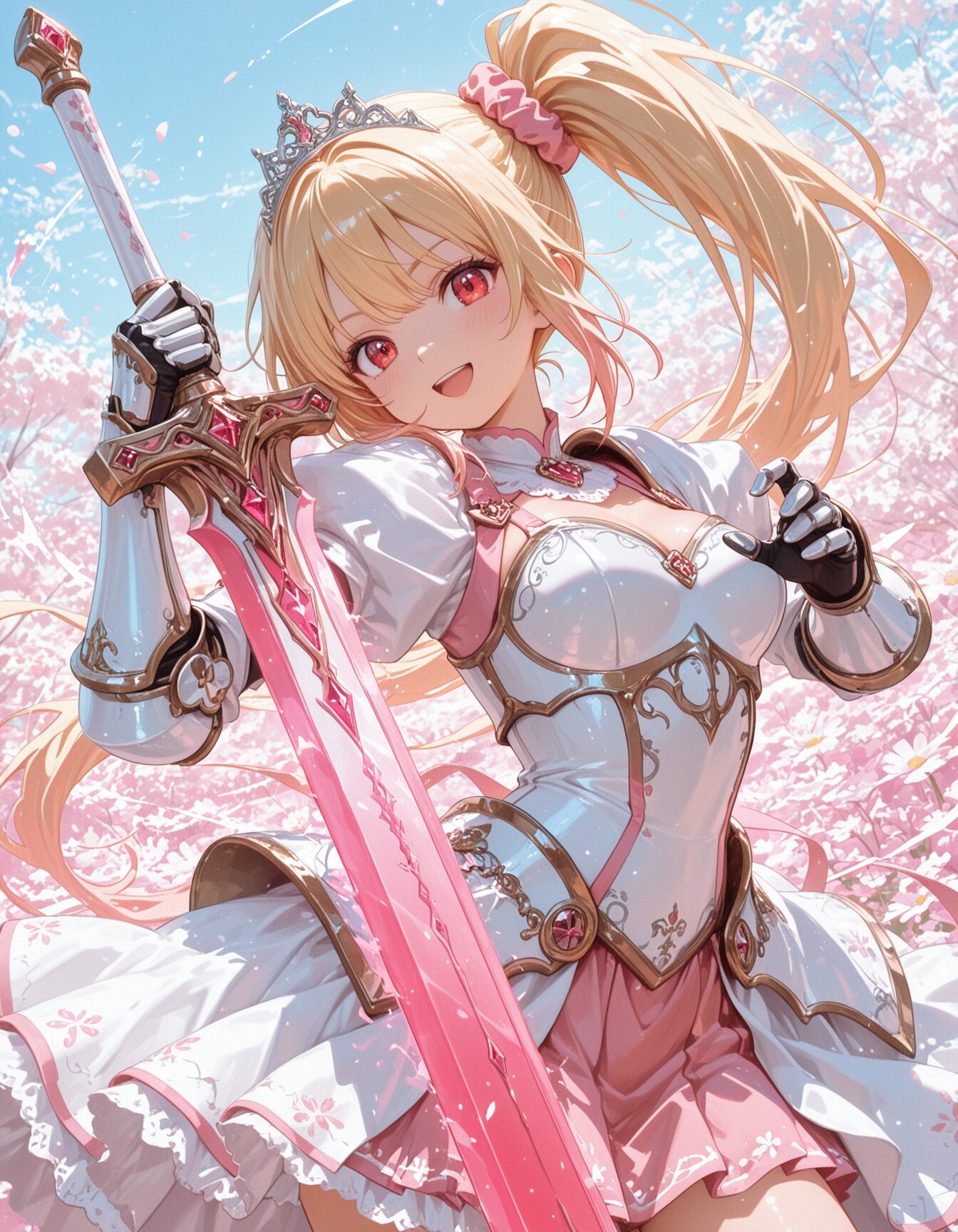 masterpiece,best quality,amazing quality,very aesthetic,absurdres,highres,newest,HDR,8K,high detail,colorful,solo,kawaii,cute,blonde hair,(pink-gradient-hair:1.2),(wavy very long side ponytail:1.1),wavy very long hair,pink scrunchie,red eyes,medium breasts,smile,open mouth,fashionable decorated princess white armor with pink accent color,segmented sword,decorated waist armor,decoreted layered_skirt,asymmetrical skirt,holding decorated gigantic sword with both hands,breast armor,tiara,gauntlet,slashing,dynamic pose,fighting stance,looking at viewer,dynamic angle,floral background,abstract,cowboy shot,