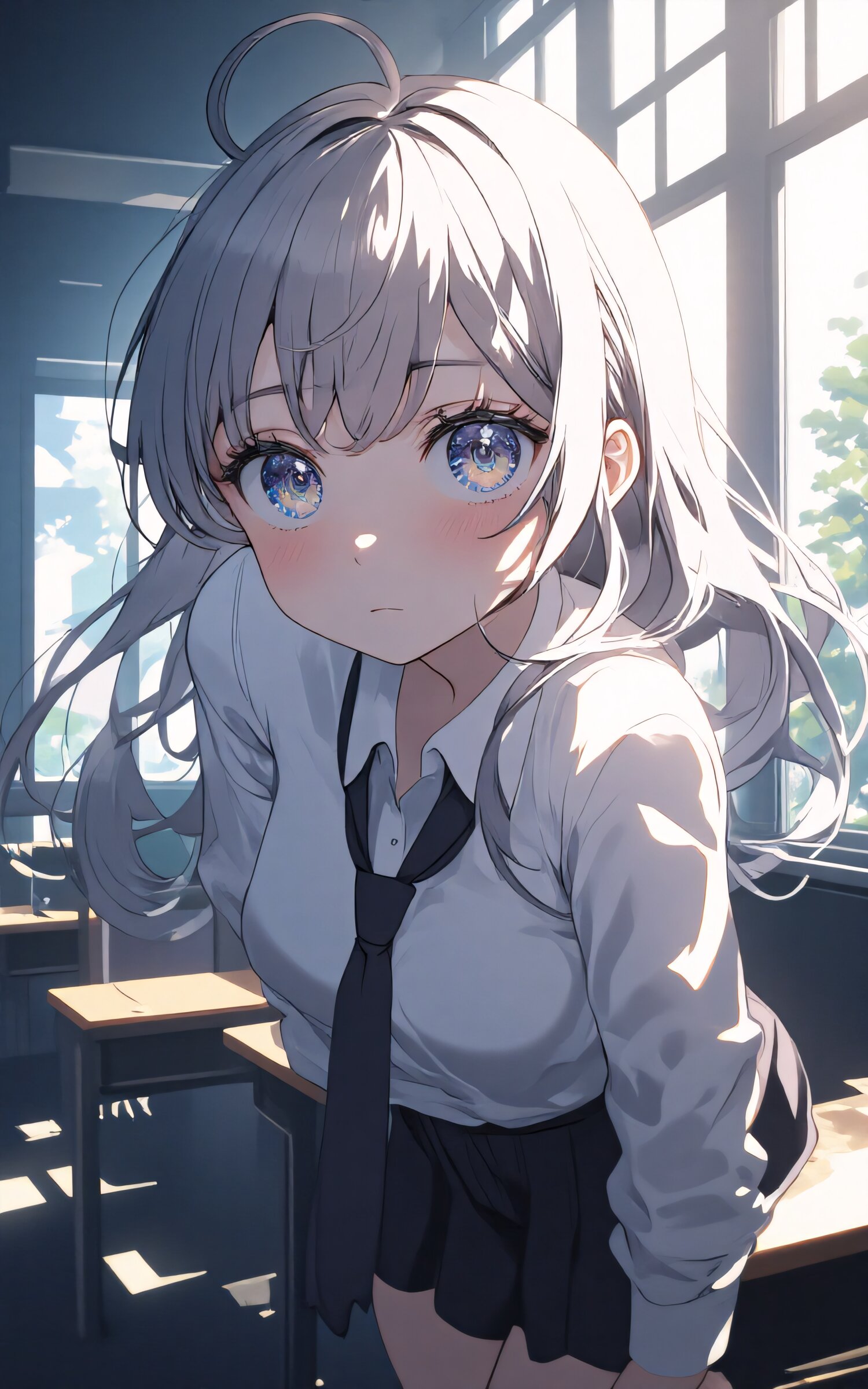 anime style, silver hair, , long hair, double eyelids, long eyelashes, , dynamic pose, dramatic angle, school uniform, white shirt, dark tie, classroom background, , sunlight through windows, soft shadows, serene atmosphere, , modern academic setting, dyncmic pose,dynamic angle