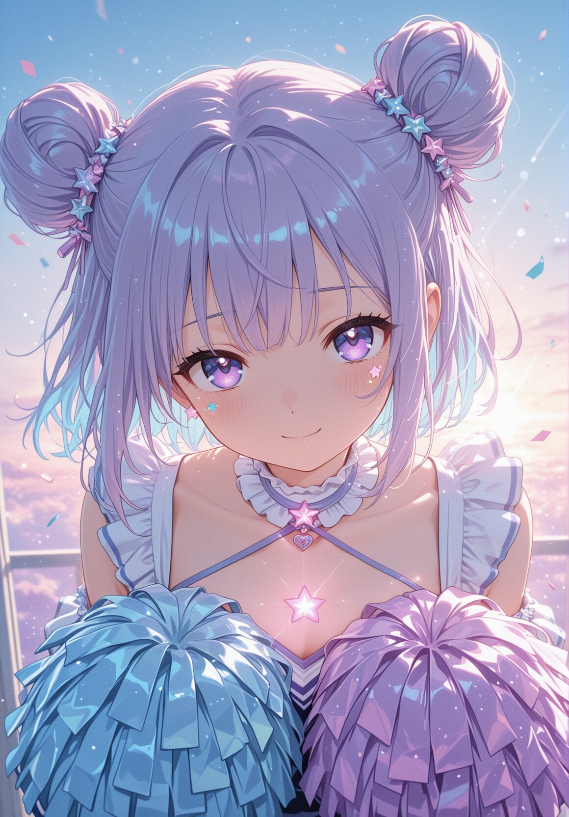 masterpiece,best quality,amazing quality,very aesthetic,absurdres,highres,newest,HDR,8K,high detail,colorful,solo, masterpiece, best quality, solo, upper body, cute anime girl with a sweet and gentle smile, looking up at viewer with sparkly purple eyes, upper-angle view, holding pastel pom-poms close together in front of chest, soft expression with slightly tilted head, soft pastel cheerleader outfit with colors matching hair (lavender and light blue), frilly top with heart motifs, star ribbons on sleeves, light flare on cheeks, long silky purple hair with vivid light blue inner highlights styled in twin buns, pastel-colored scrunchies, glowing dreamy background with sparkles and floating confetti, thin delicate lineart, watercolor texture, soft pastel color palette, gentle light, fluffy textures, magical and cute mood