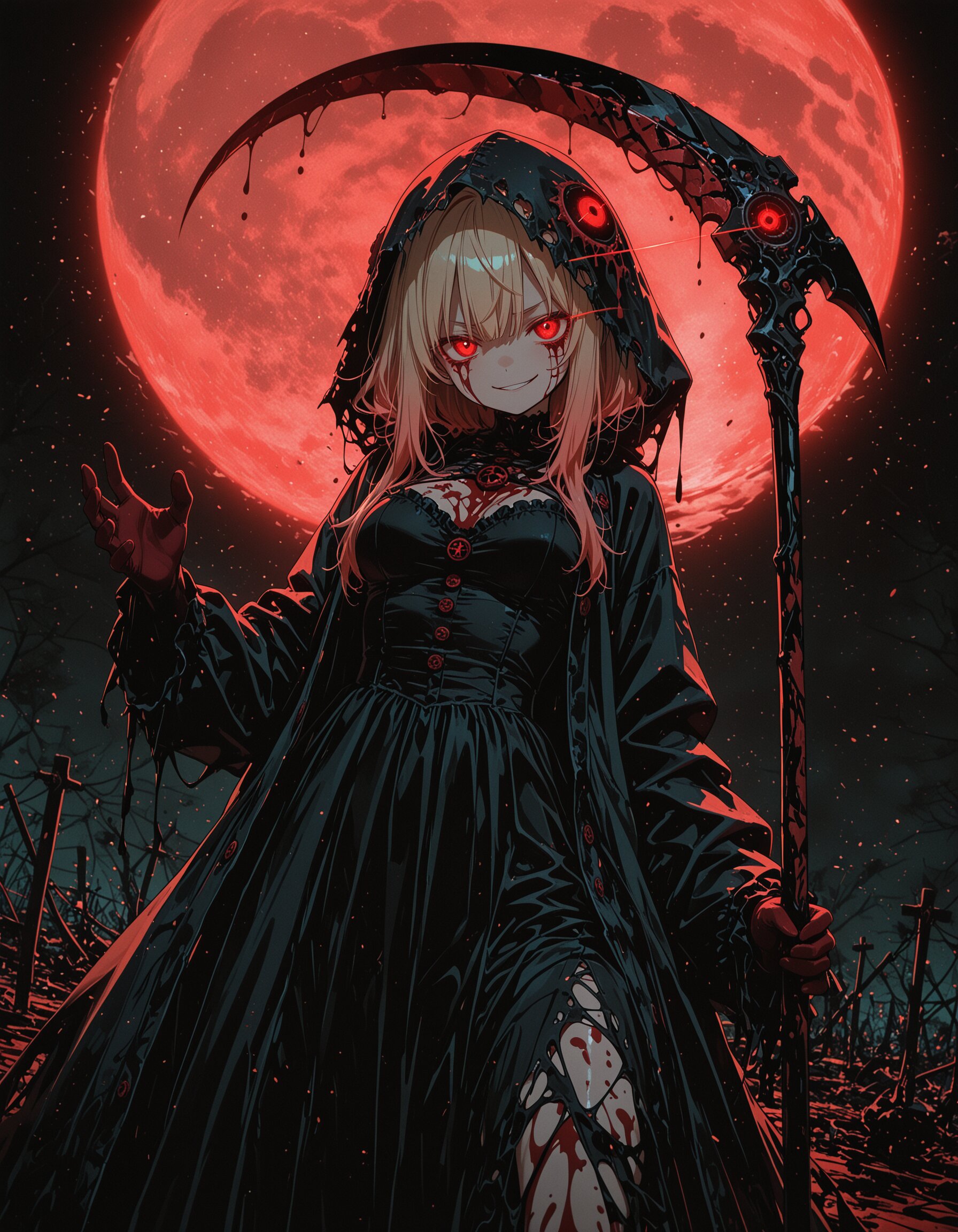 masterpiece,best quality,amazing quality,solo,kawaii,cute,teen,blonde hair,(pink-gradient-hair:1.1),red eyes,medium breasts,smirk,death costume,holding decorated creepy glowing red death's scythe,fashionable decorated creepy dress,(eye trail:1.2),decorated torn hood coat with red accent,fighting stance,creepy background,dynamic pose,dynamic angle,glowing eyes,red moon,night,abstract,looking at viewer,red ink,