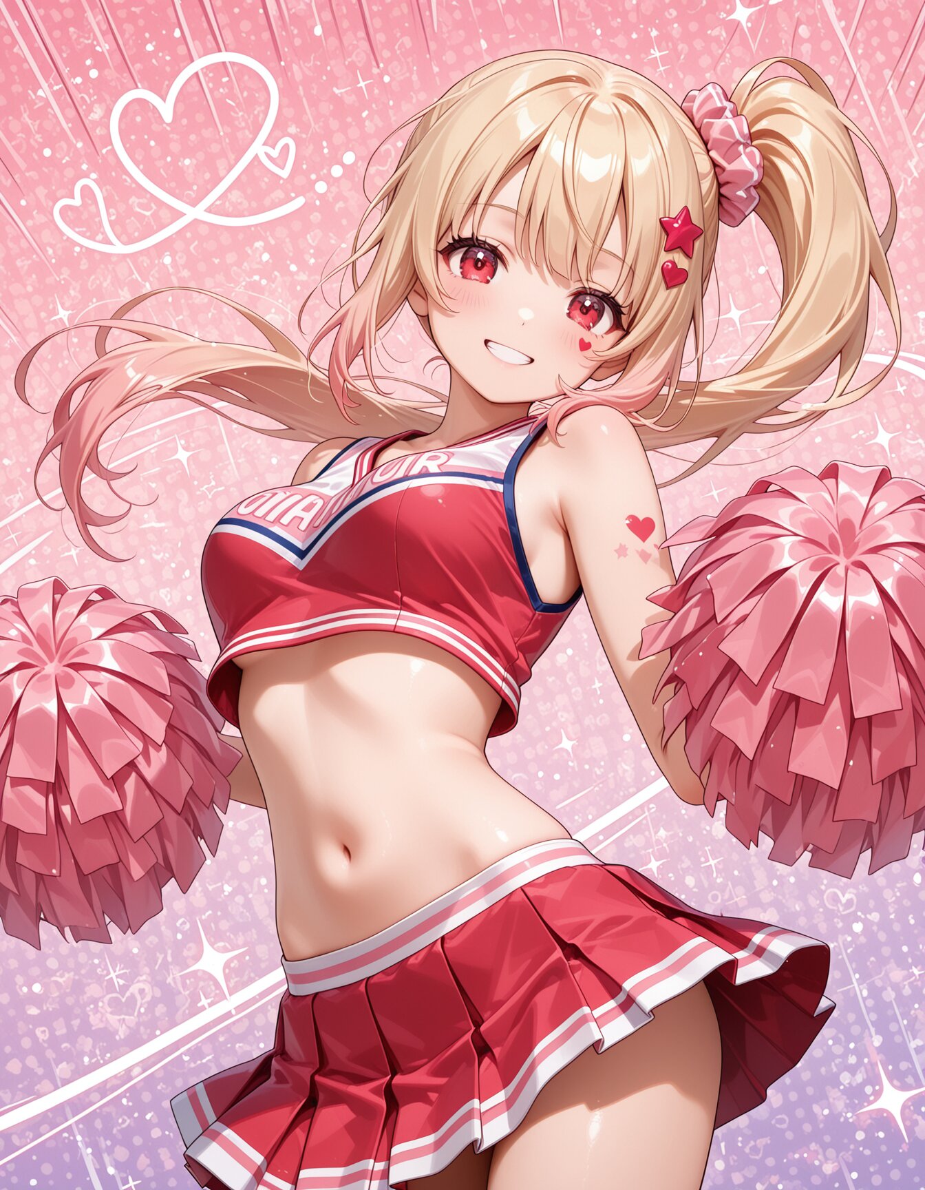 masterpiece,best quality,good quality,solo,kawaii,cute,blonde hair,(pink-gradient-hair:1.1),(wavy very long side ponytail:1.1),japanese hair ornament,pink scrunchie,red eyes,medium breasts,grin,cheerleader,midriff,sleeveless,pom poms,dancing,dynamic angle,heart mark,star mark,kawaii background,abstract background,sparkle background,looking at viewer,spinning,cowboy shot,motion_lines,